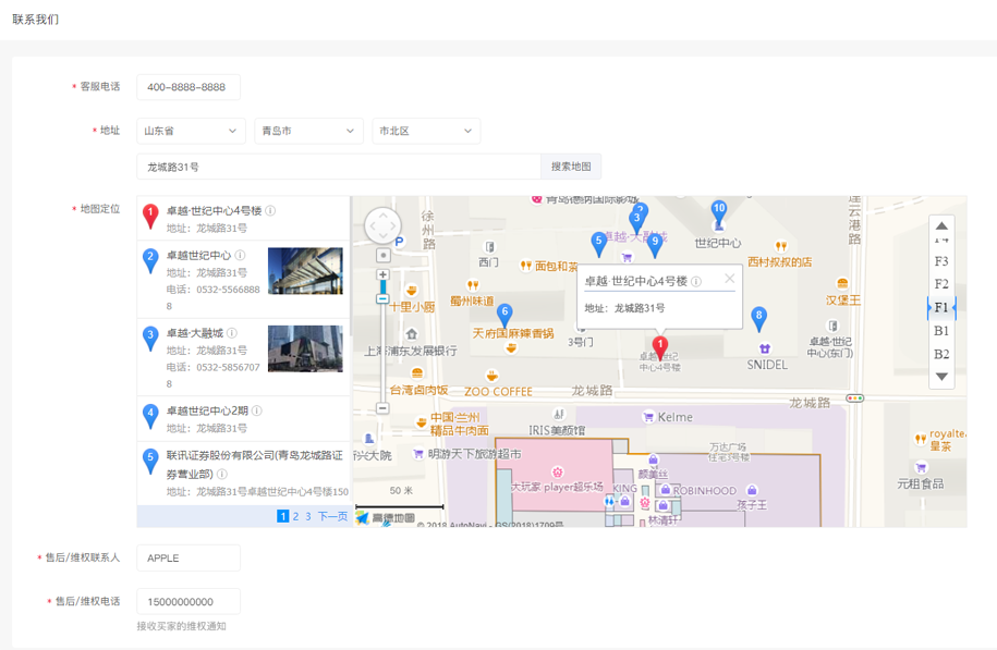 填写商城客服电话、店铺地址以及售后维权联系人和电话。