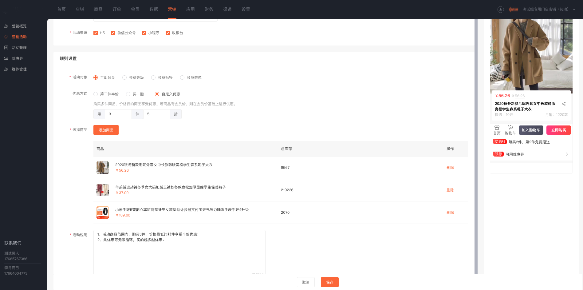 (3)活动说明商家可编辑修改,说明在手机端活动界面展示,方便会员了解活动规则。