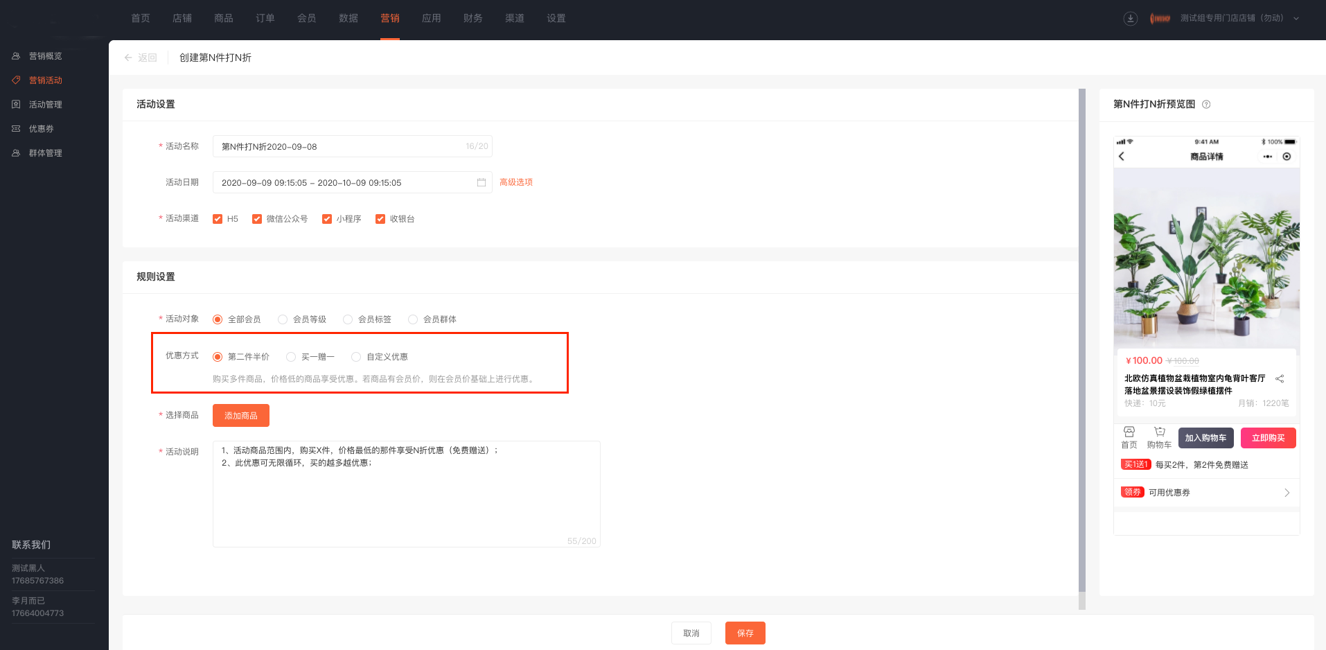 (1)根据活动需要,选择合适的优惠方式:第二件半价,买一赠一或自定义优惠。