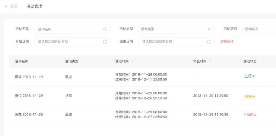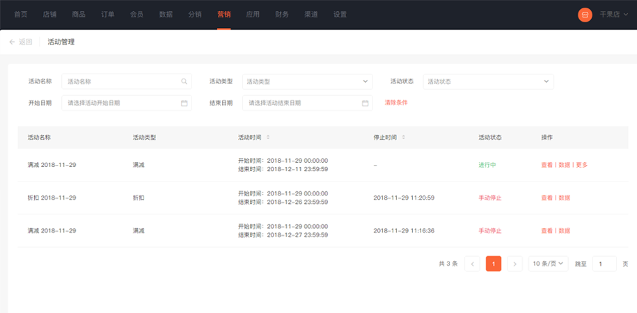 营销的活动管理是给业务端商家提供统计商城营销活动,商家可以随时查看各类型活动的结束时间以及活动的状态,还可将正在进行的活动手动停止,此功能同事也为商家提供活动数据,商家可根据数据活动数据信息,判断活动的收益,及时停止收益较低的活动等,对活动带来的影响力进行分析,得到较为准确的营销方向。