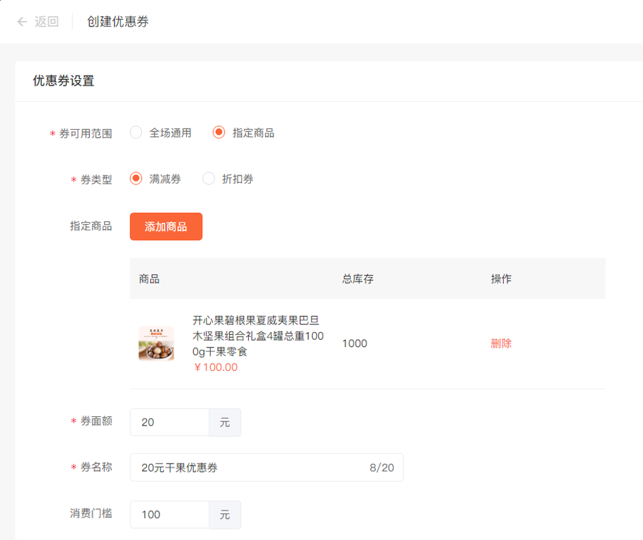 商家在元旦期间设置了优惠券活动,优惠券面额设置了20元,消费门槛设置了100元,那只有会员购买商品满100元时才能使用该优惠券。