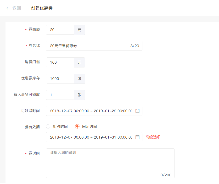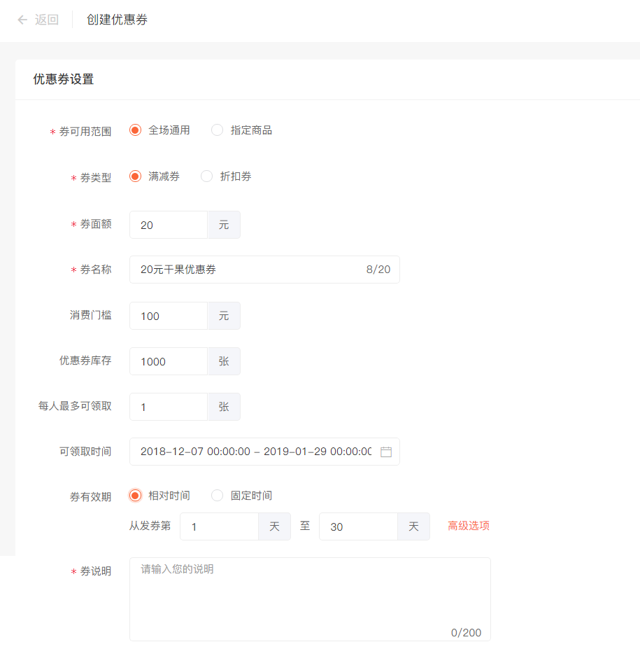 优惠券有效期可设置相对时间,比如从发优惠券的第一天到第十天。也可以设置为固定时间,高级选项可精确到几时几分。