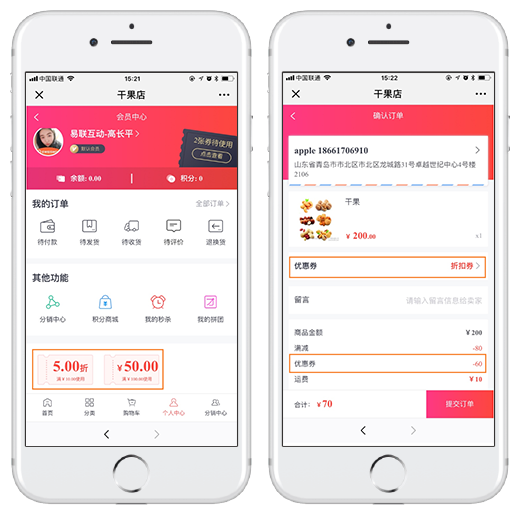 业务端商家可通过优惠券的满减或者折扣,跟商城的满额立减或者折扣搭配使用,实现再次提升商品销量,商家创建的优惠券,通过店铺装修可在商城首页、个人中心和商品详情等页面显示,会员在商城领取优惠券,结算时符合优惠券条件即可享受优惠福利。