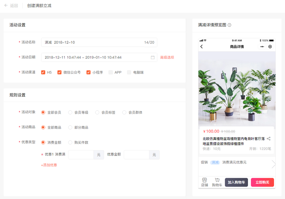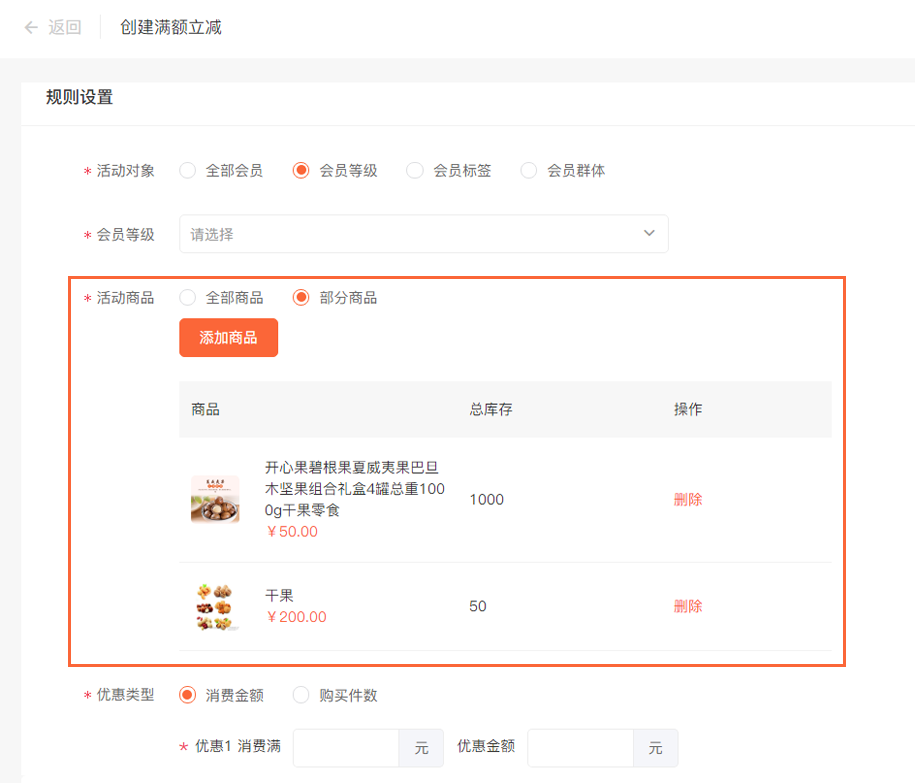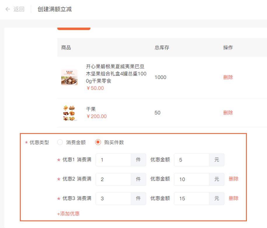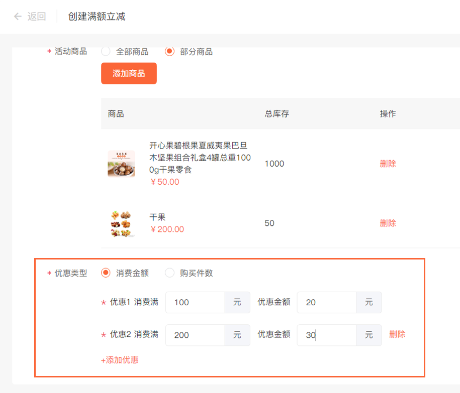 第四步:业务端商家设置满额立减活动的优惠类型有两种:消费满多少元可减多少元和消费多少件可减多少元。
