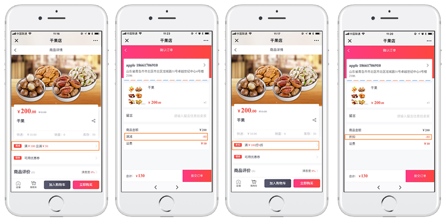 1.满额立减活动设置了订单满100减50,满200减80,满300减100,商品A和商品B参与了满减的活动,会员购买商品B价格为200元,满足了满200减80的条件,在支付的时候享受立减80元的优惠,只需要支付120元即可。