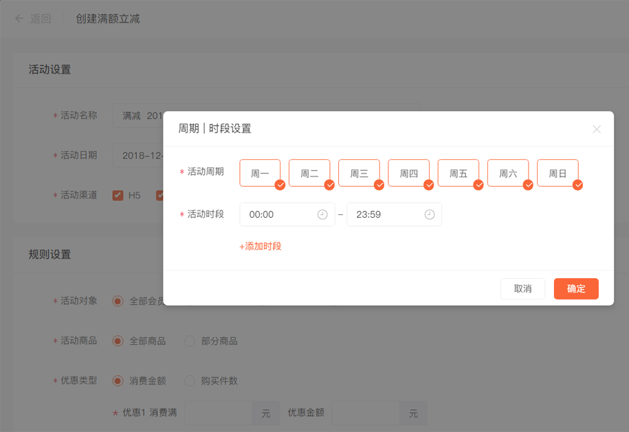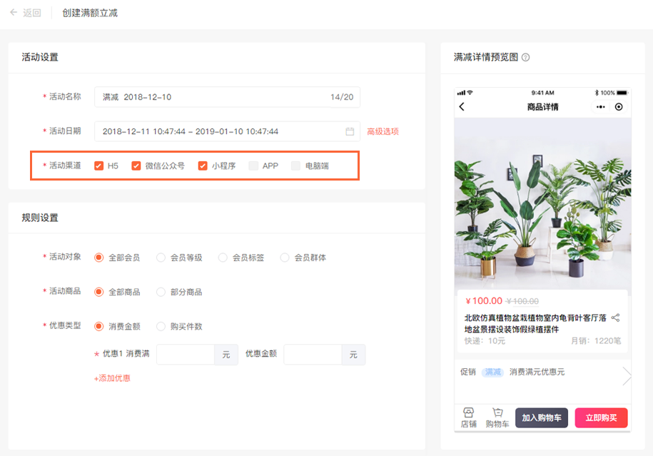 业务端商家点击营销—营销活动—满额立减,商家填写活动名称、活动周期丨时间段、活动渠道和对象以及选择活动的商品,见下图: