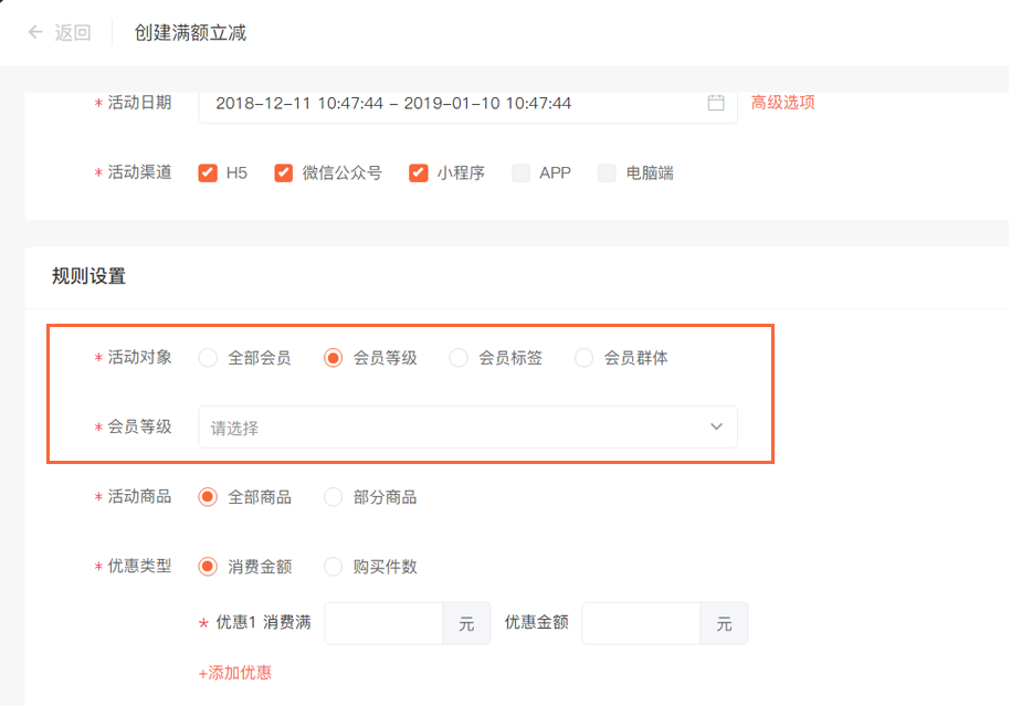 3、业务端商家选择活动对象,会员等级、会员标签和会员群体只能选择一个等级或标签。