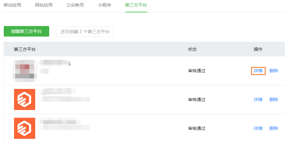 管理端管理员登录微信开放平台—管理中心—第三方平台,点击详情。
