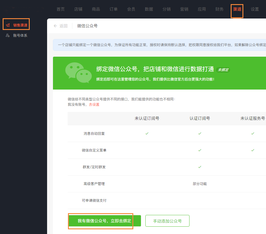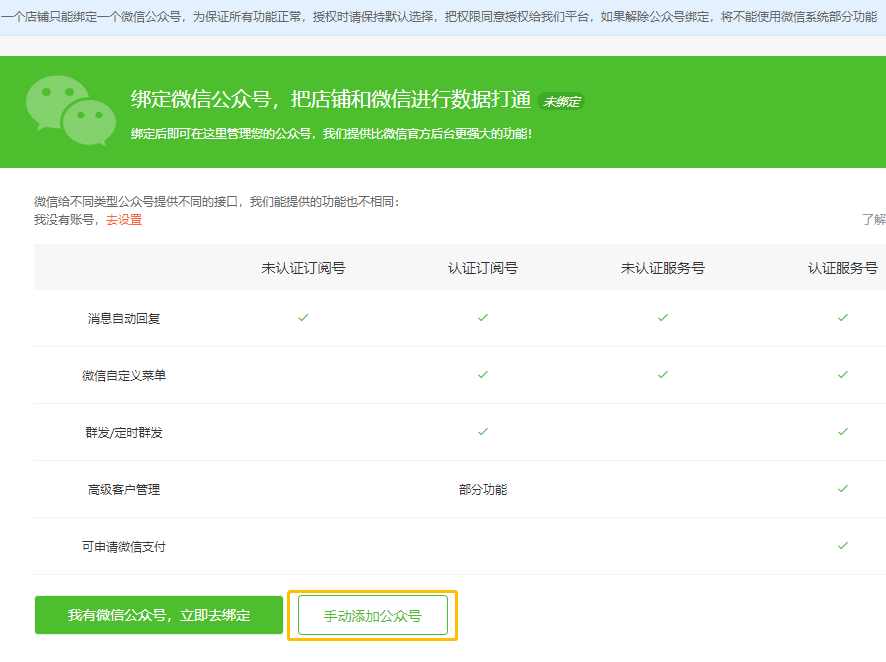 对接绑定公众号是有两种方式:已有公众号扫码授权绑定、手动添加公众号