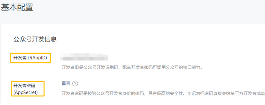 业务端管理员登录微信公众平台,在左侧列表点击开发—基本配置,可以获取AppID和AppSecret。