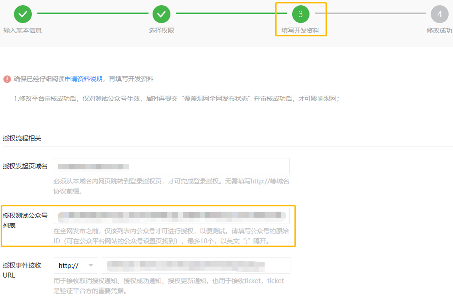 点击下一步至填写开发资料页面,在授权测试公众号列表中添加公众号原始ID。