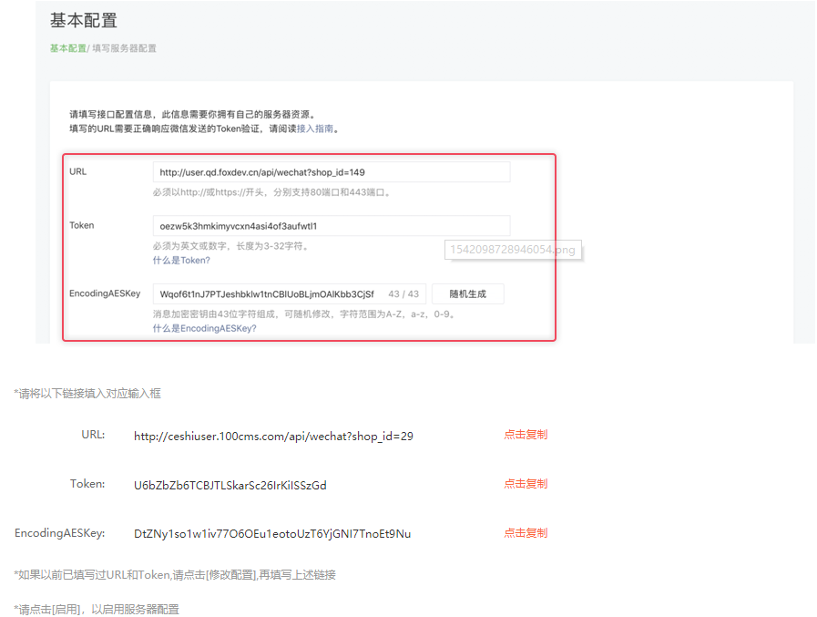 第三步:公众号信息设置完成后,点击下一步,根据公众号设置引导将URL、Token和EncodingAESKey的参数复制到微信公众号平台的相应位置,提交后启用。