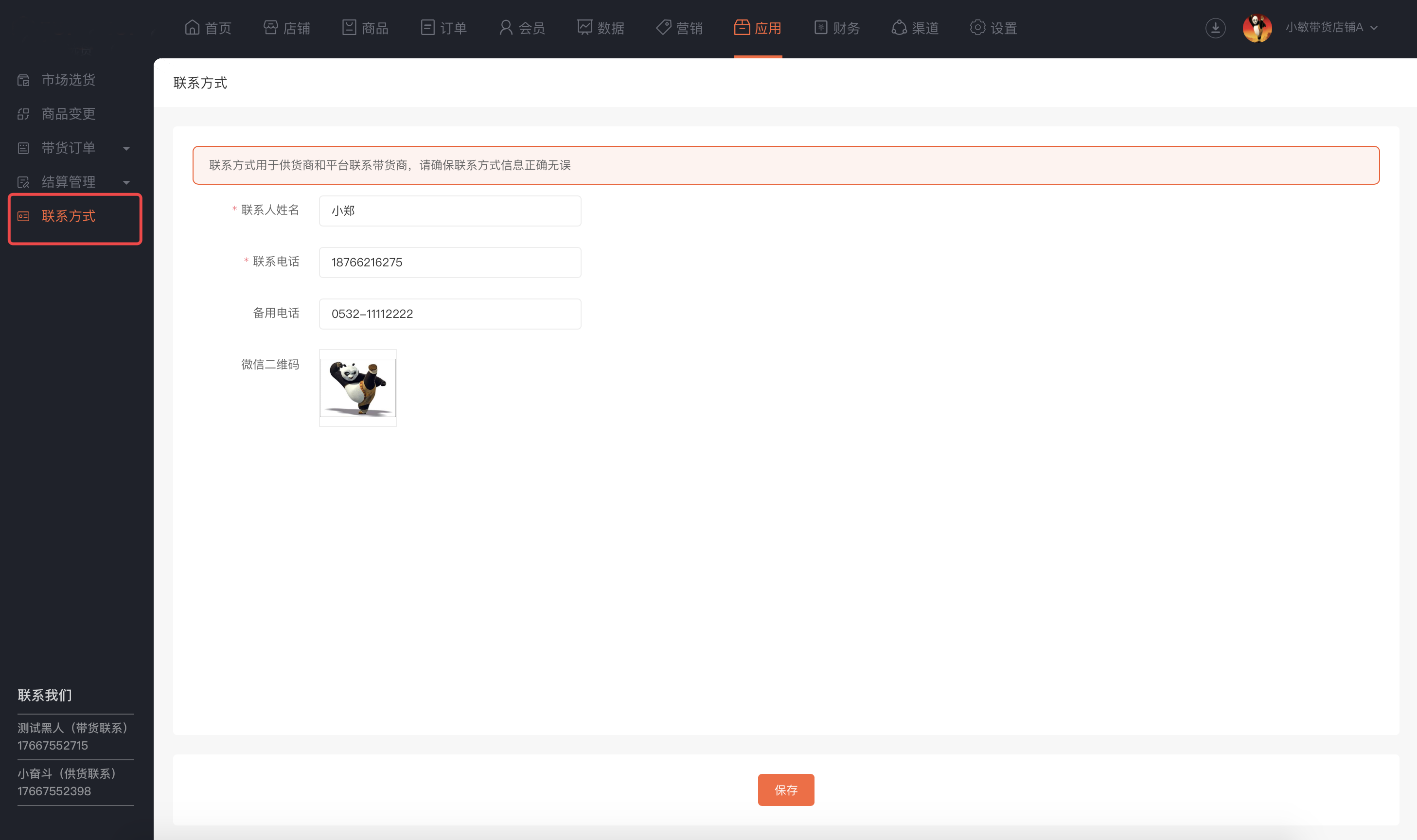 如果管理端启用“联系客服”成为供货商,业务端将显示“供货商”入口,店铺可点击供货商应用获取申请联系方式