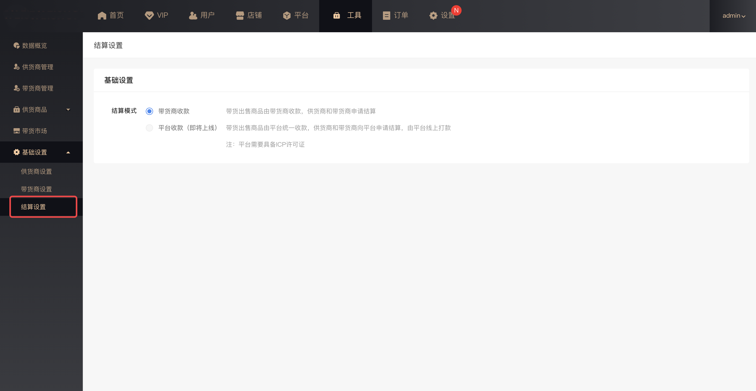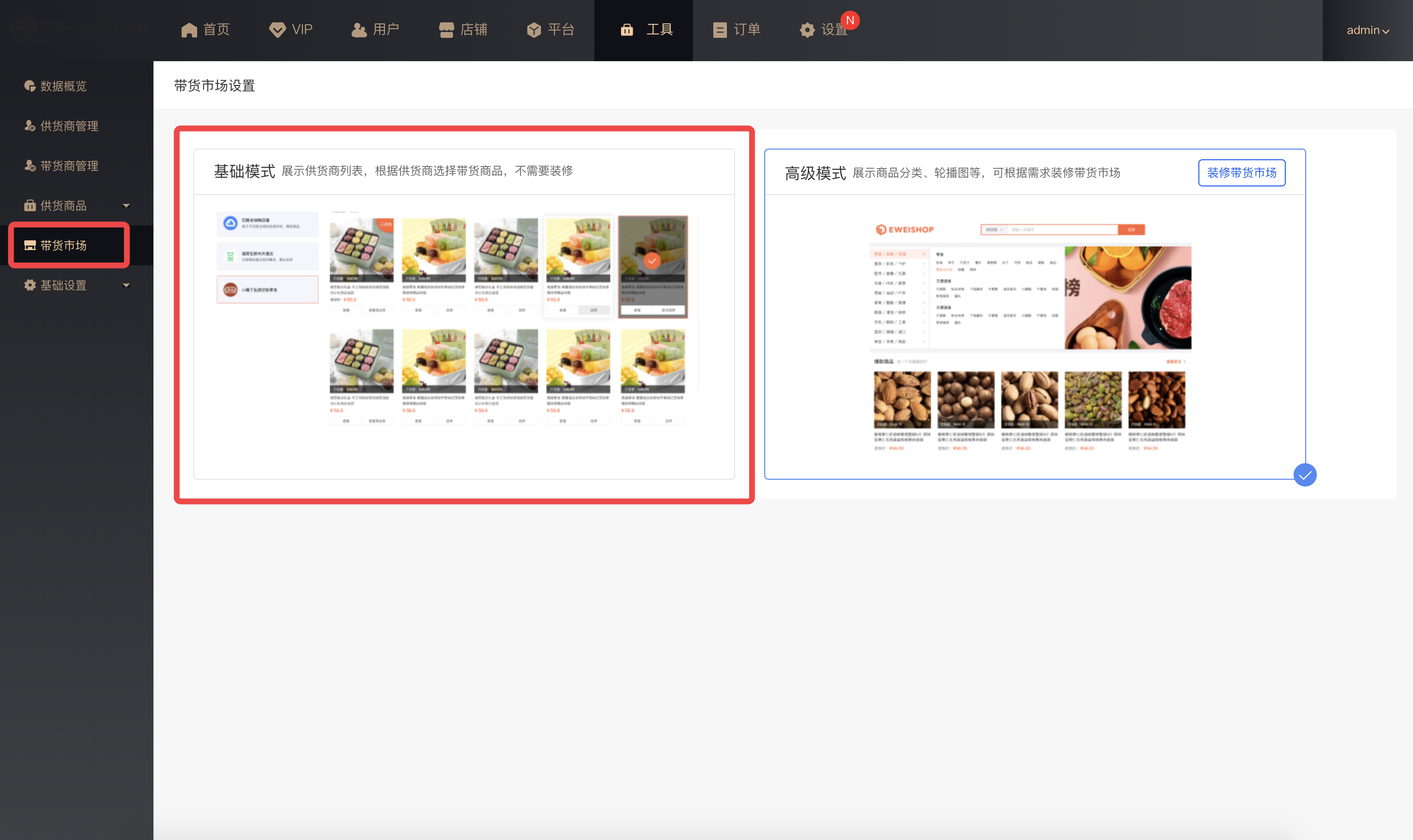 系统提供2套带货市场模式供平台选择