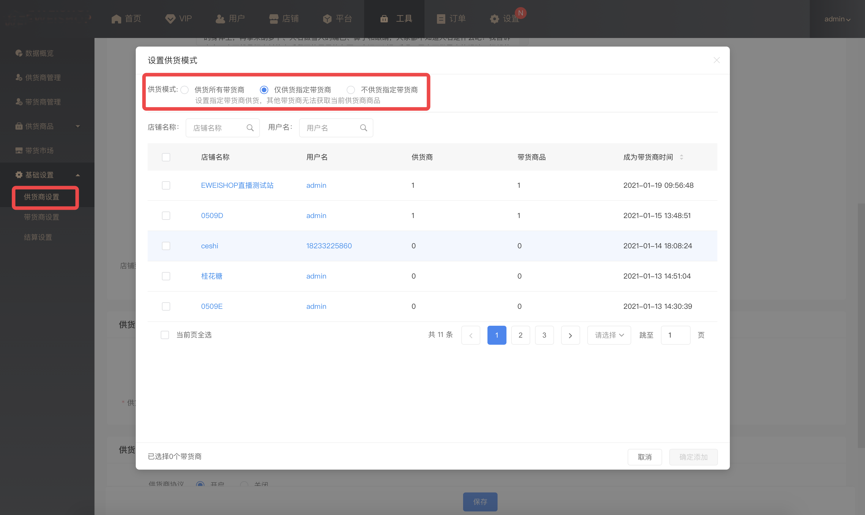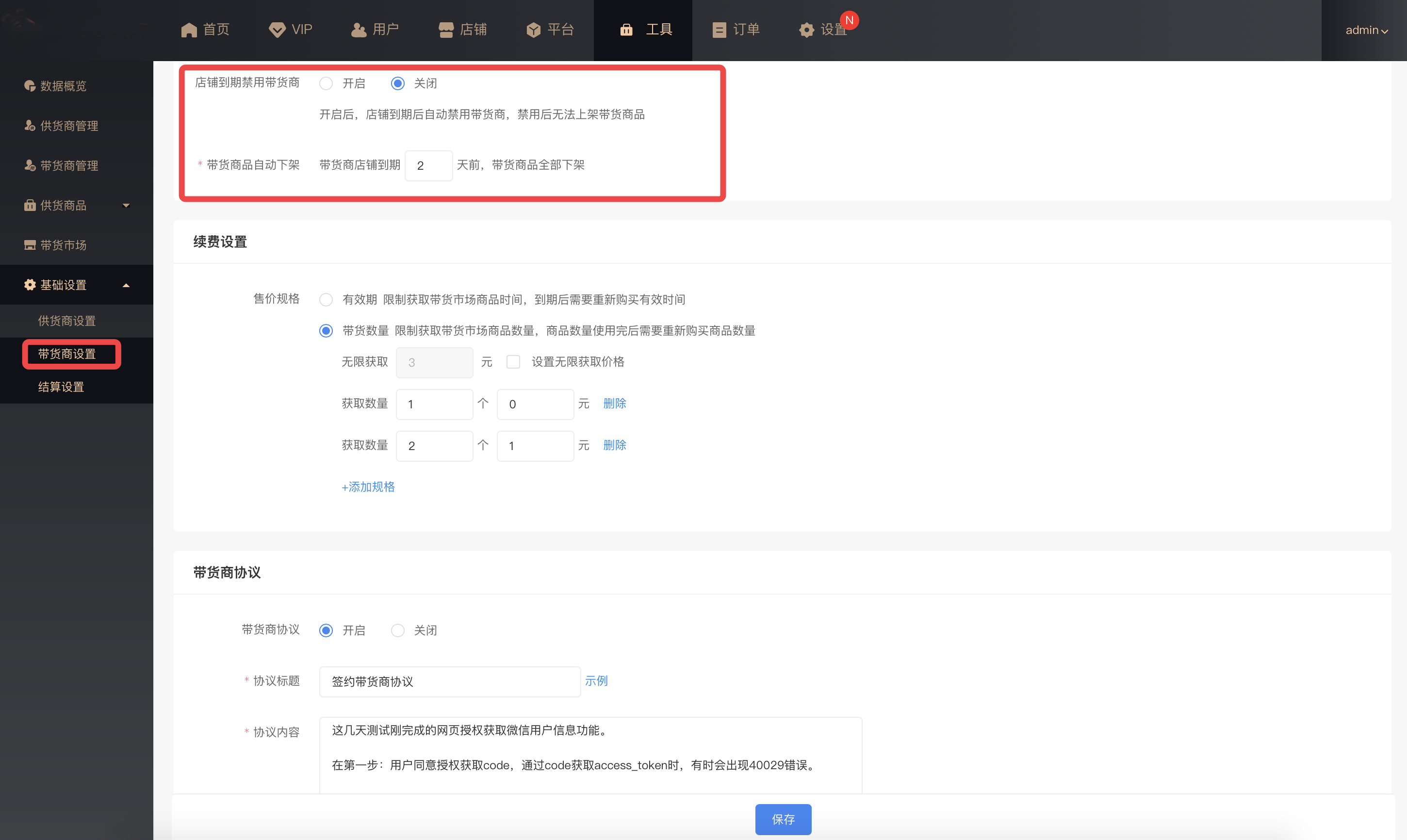 可带货供货商:设置该店铺可带货的供货商店铺,其他供货商商品将无法获取