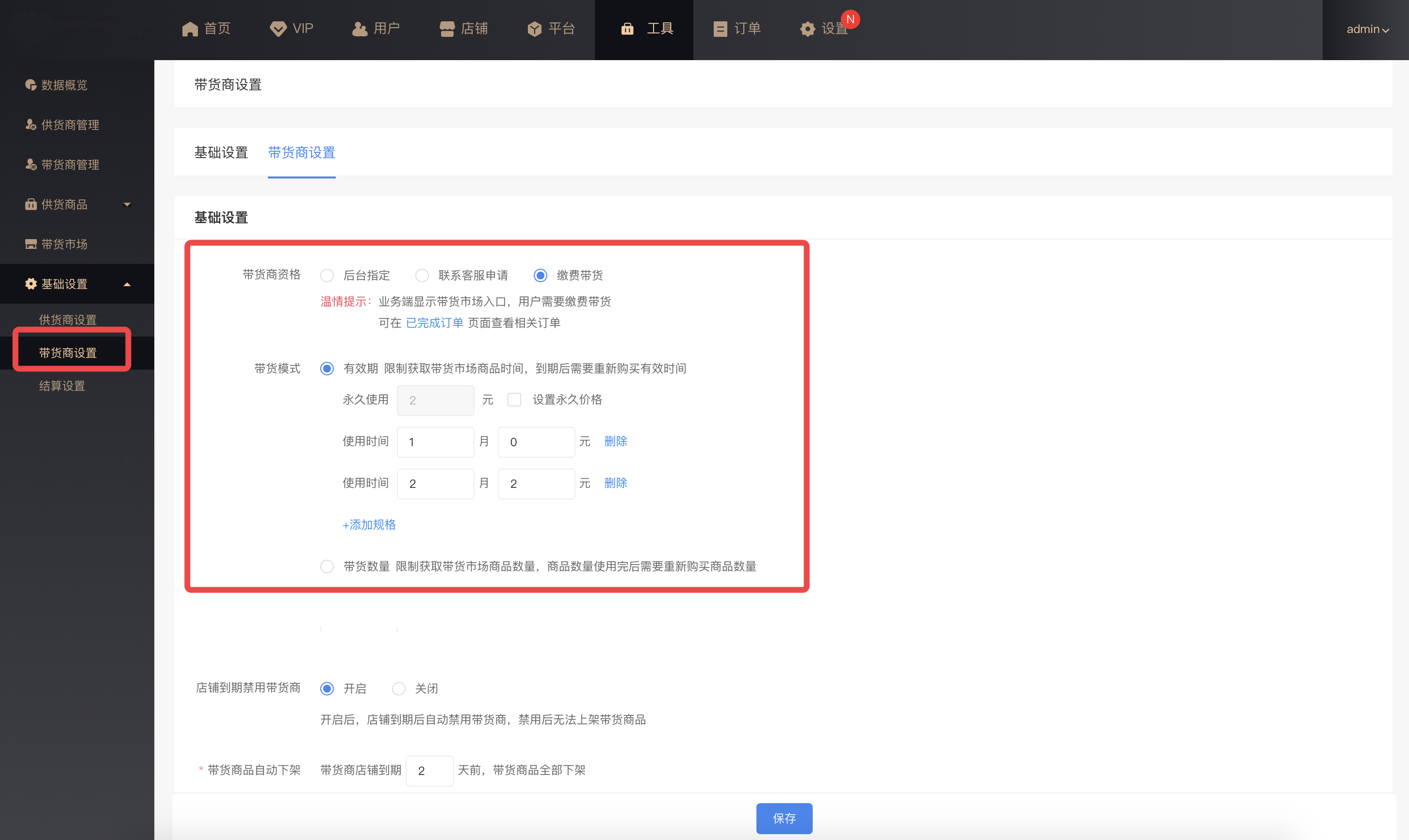 供货商品自动下架:可设置供货商店铺到期前N天,自动从带货市场下架供货商品