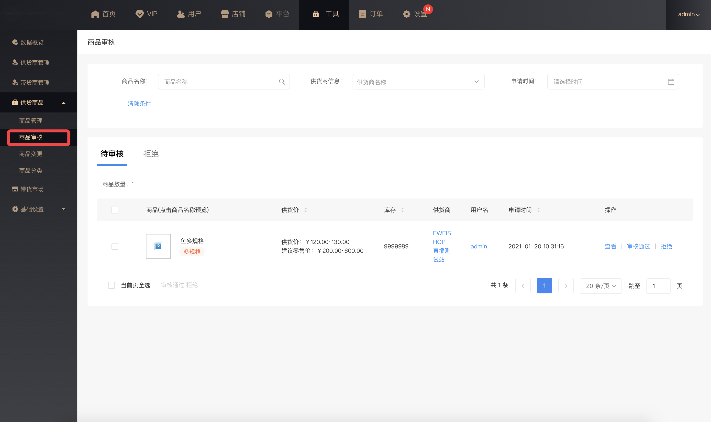 商品审核:平台可以对供货商品进行审核,审核通过后才可上架到带货市场