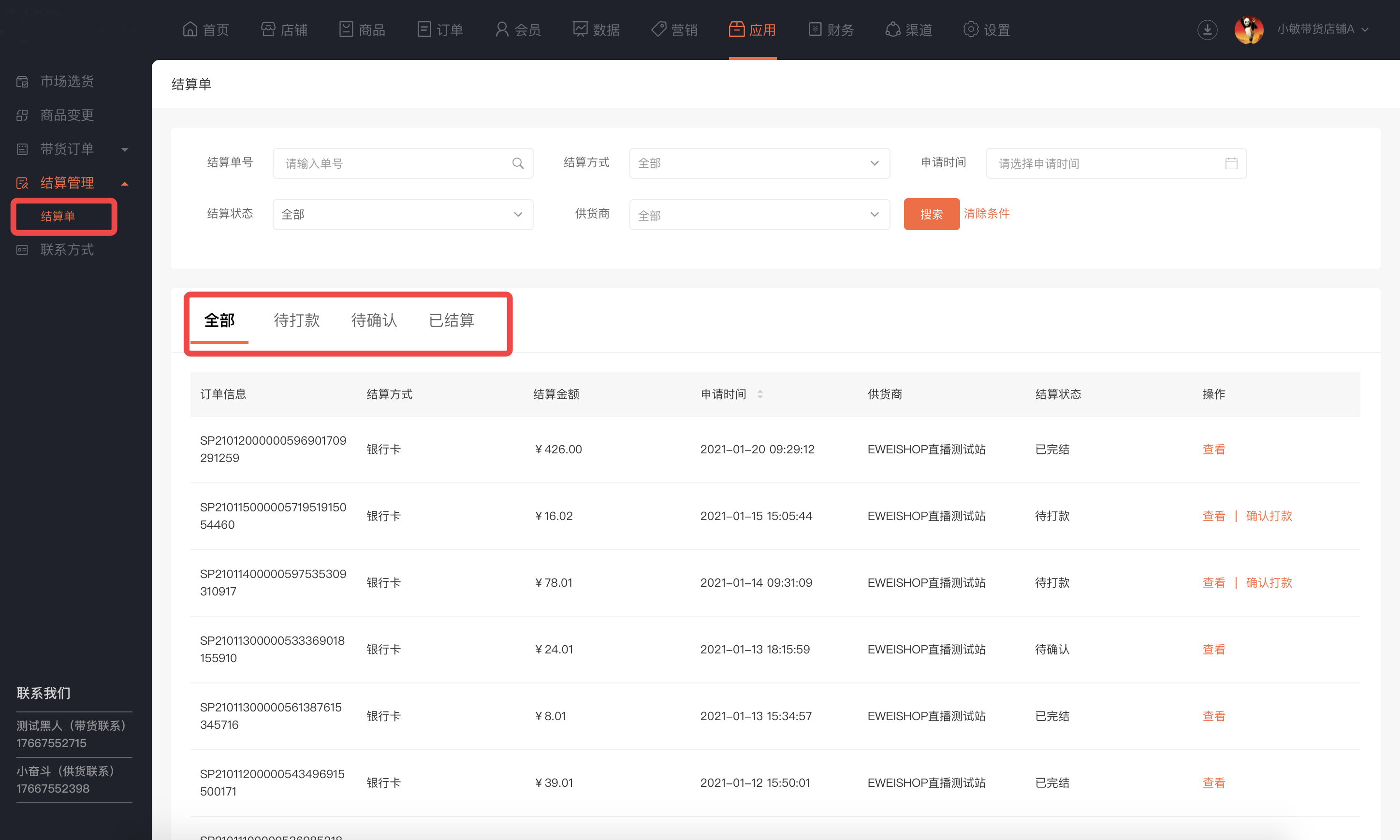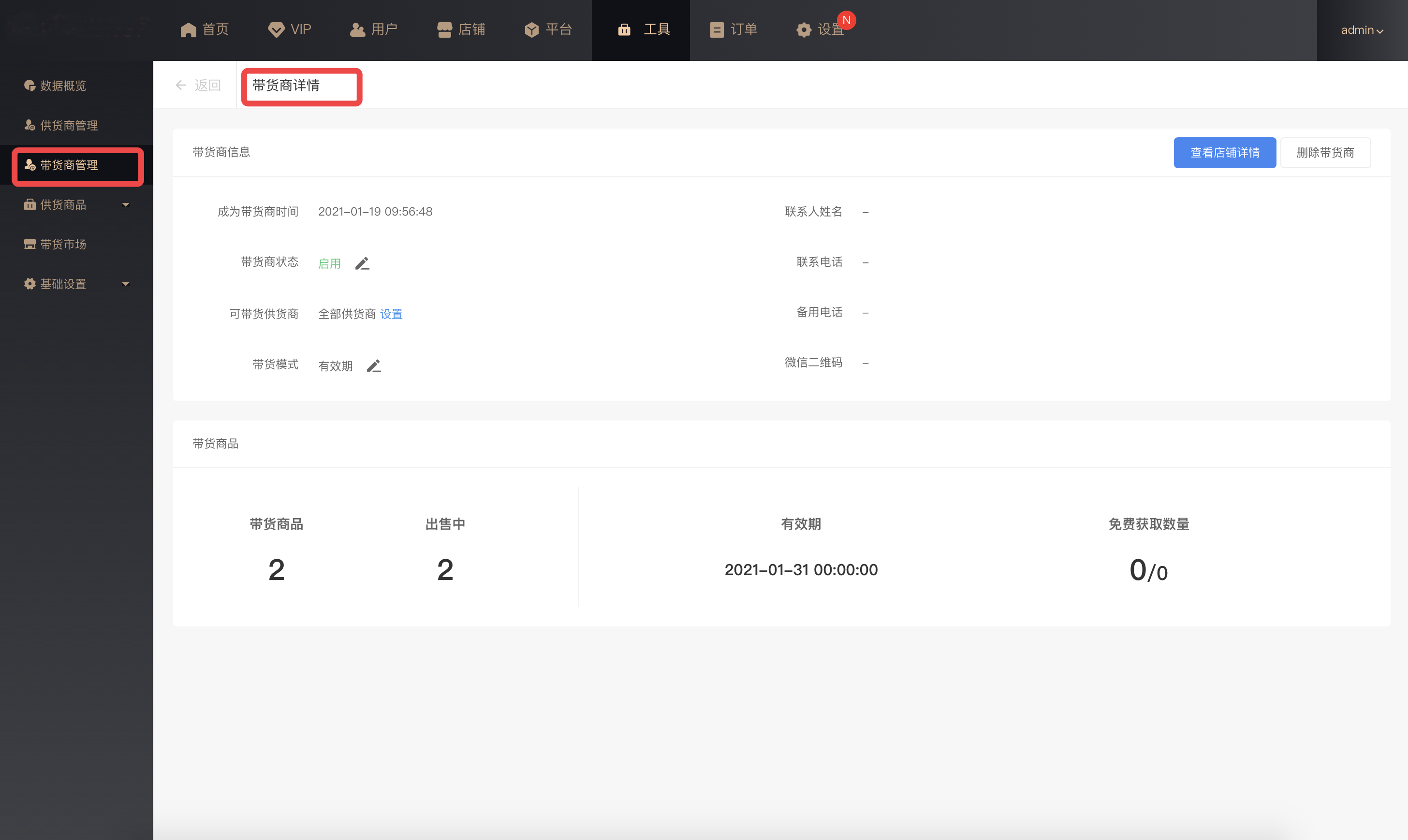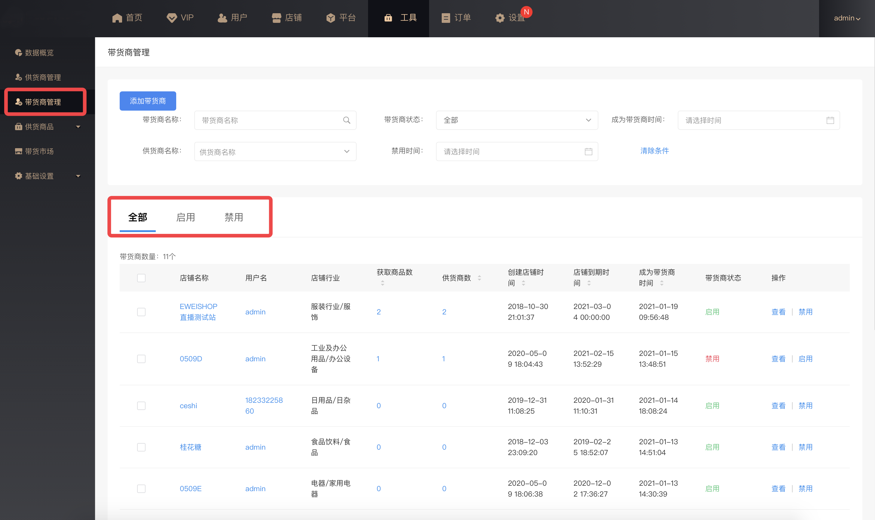 带货商状态:启用(店铺正常使用带货市场功能,获取供货商品)