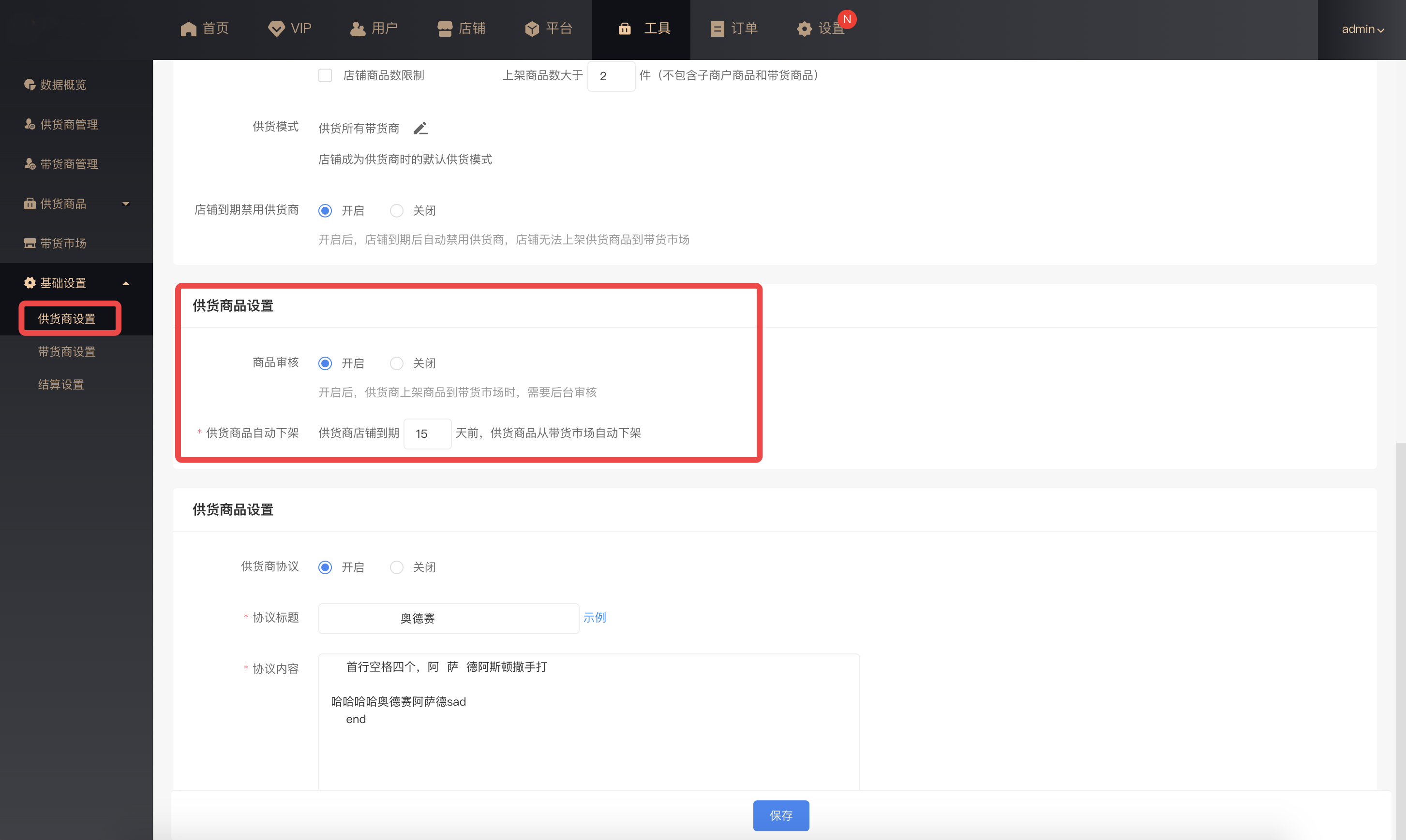 ES管理端后台 - 工具 - 供货商(平台设置供货商和带货商规则,装修带货市场)