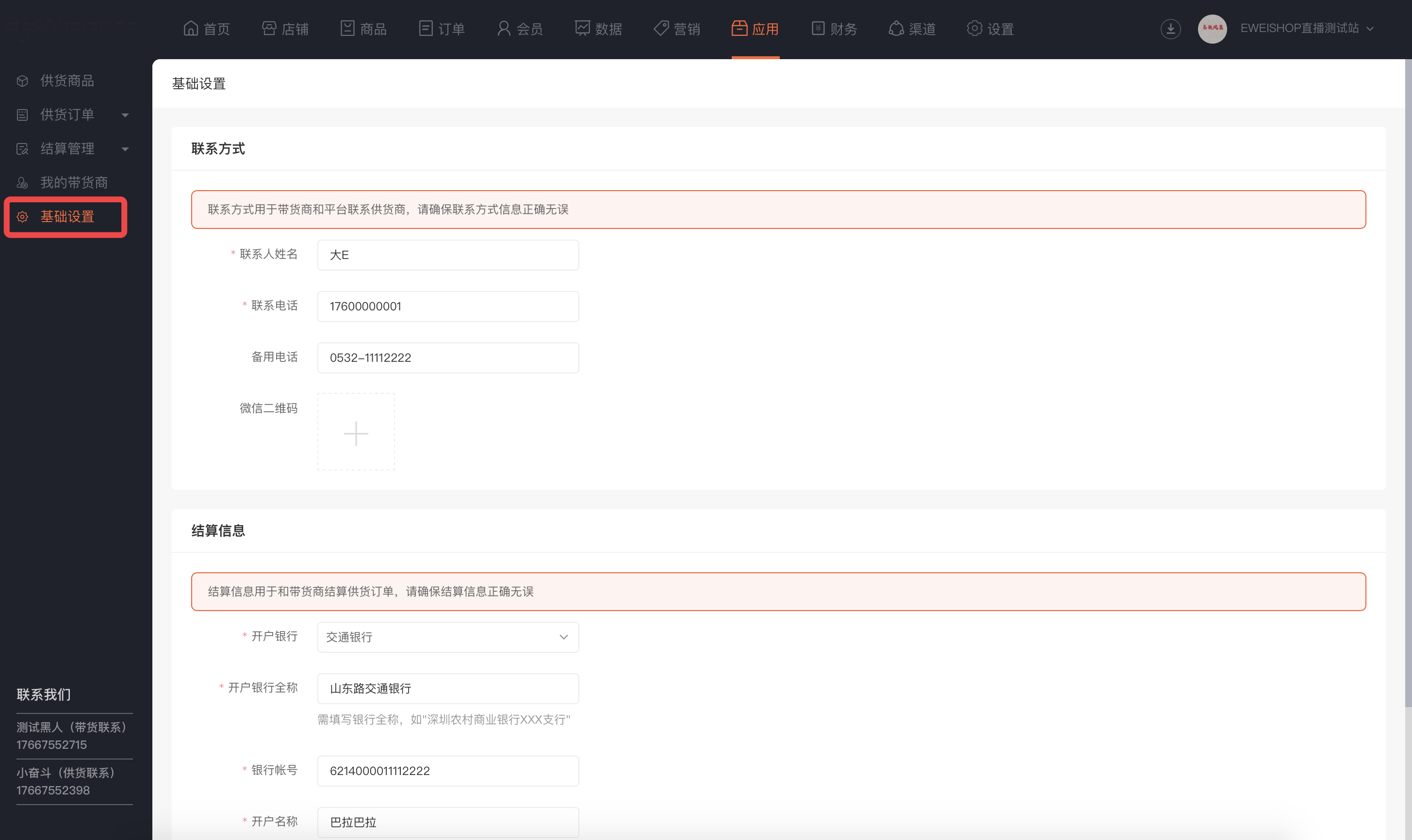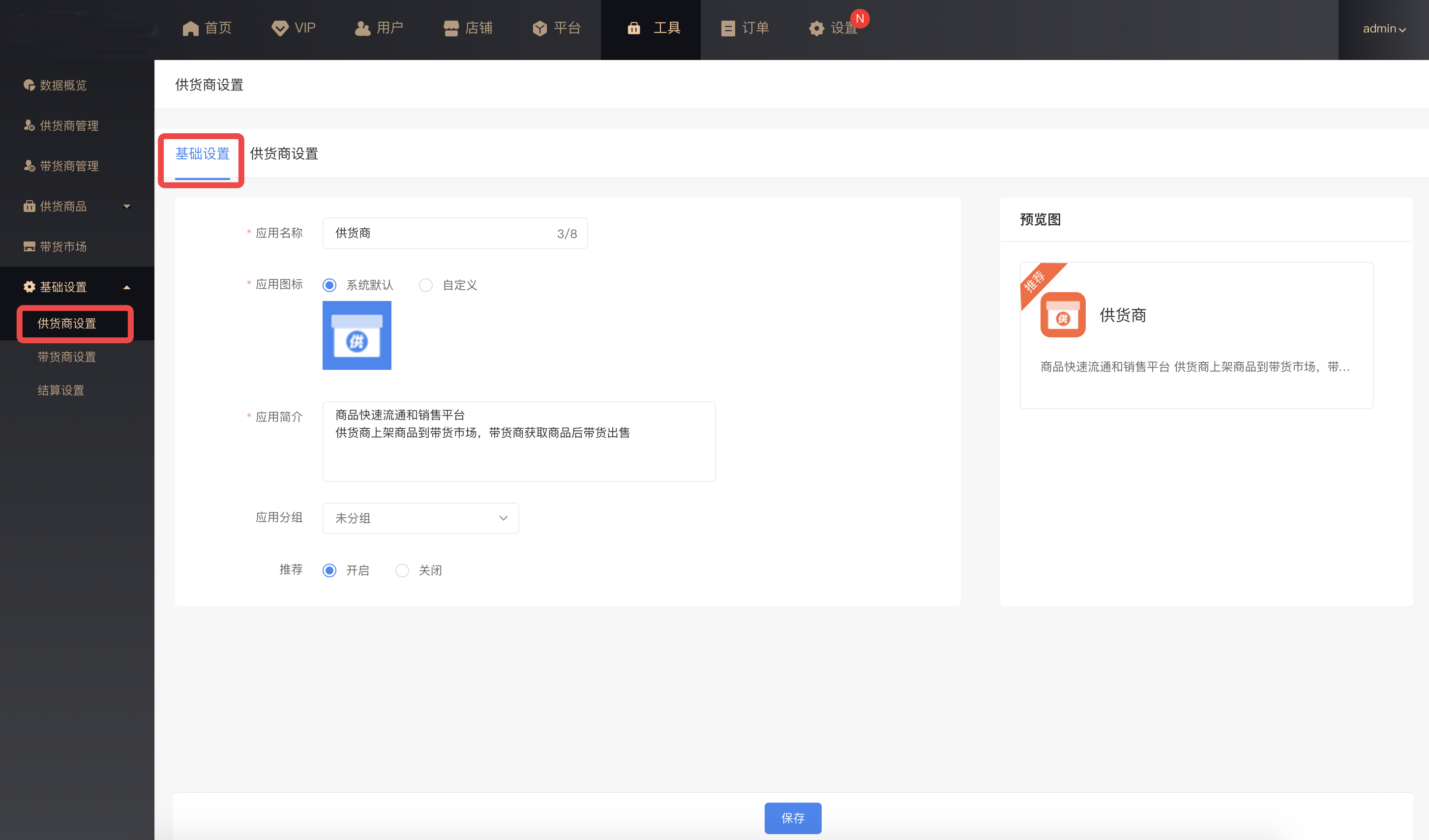 基础设置:平台可设置“供货商”应用名称和应用简介及应用分组