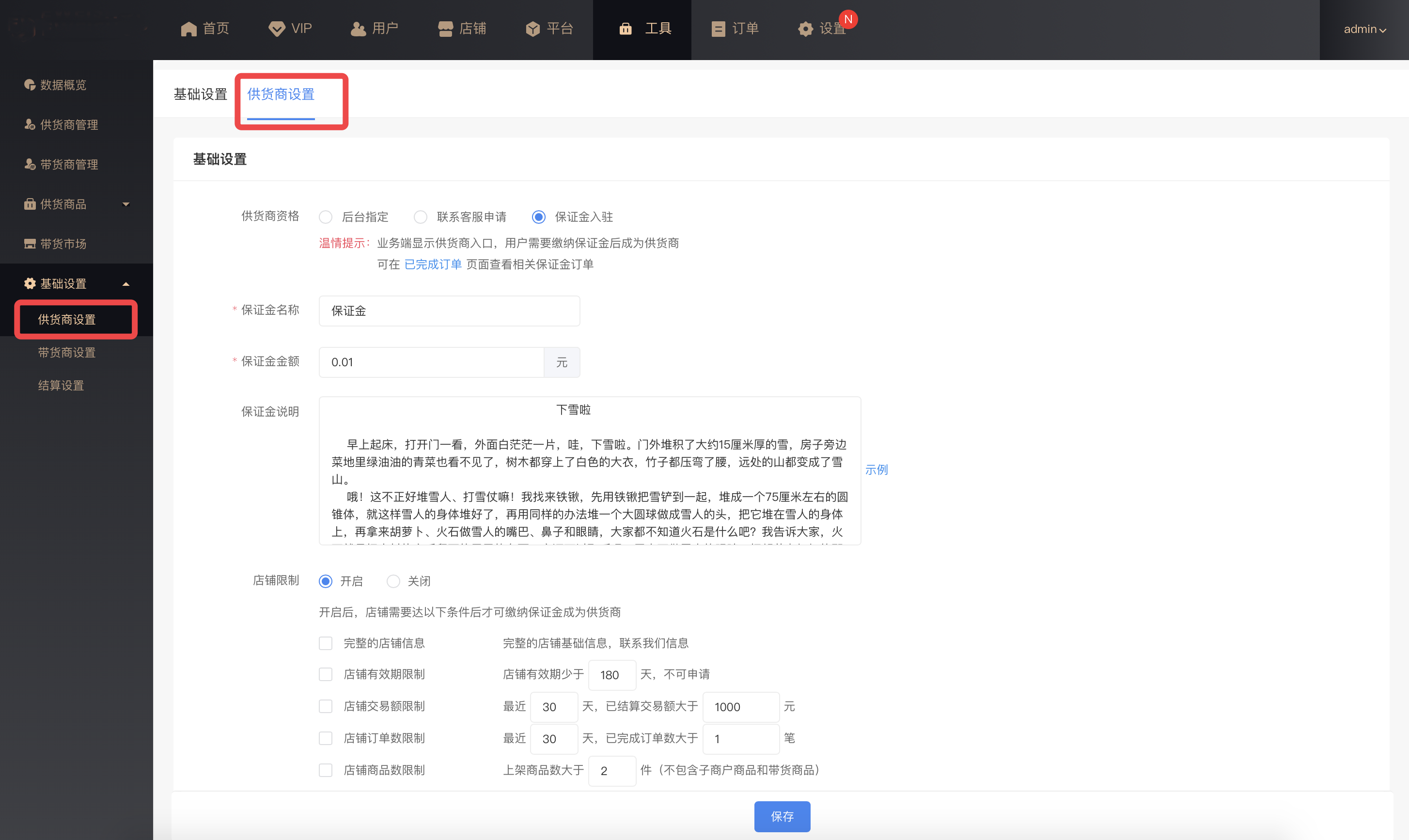 保证金入驻(业务端开放供货商入口,店铺可缴纳保证金后成为供货商)