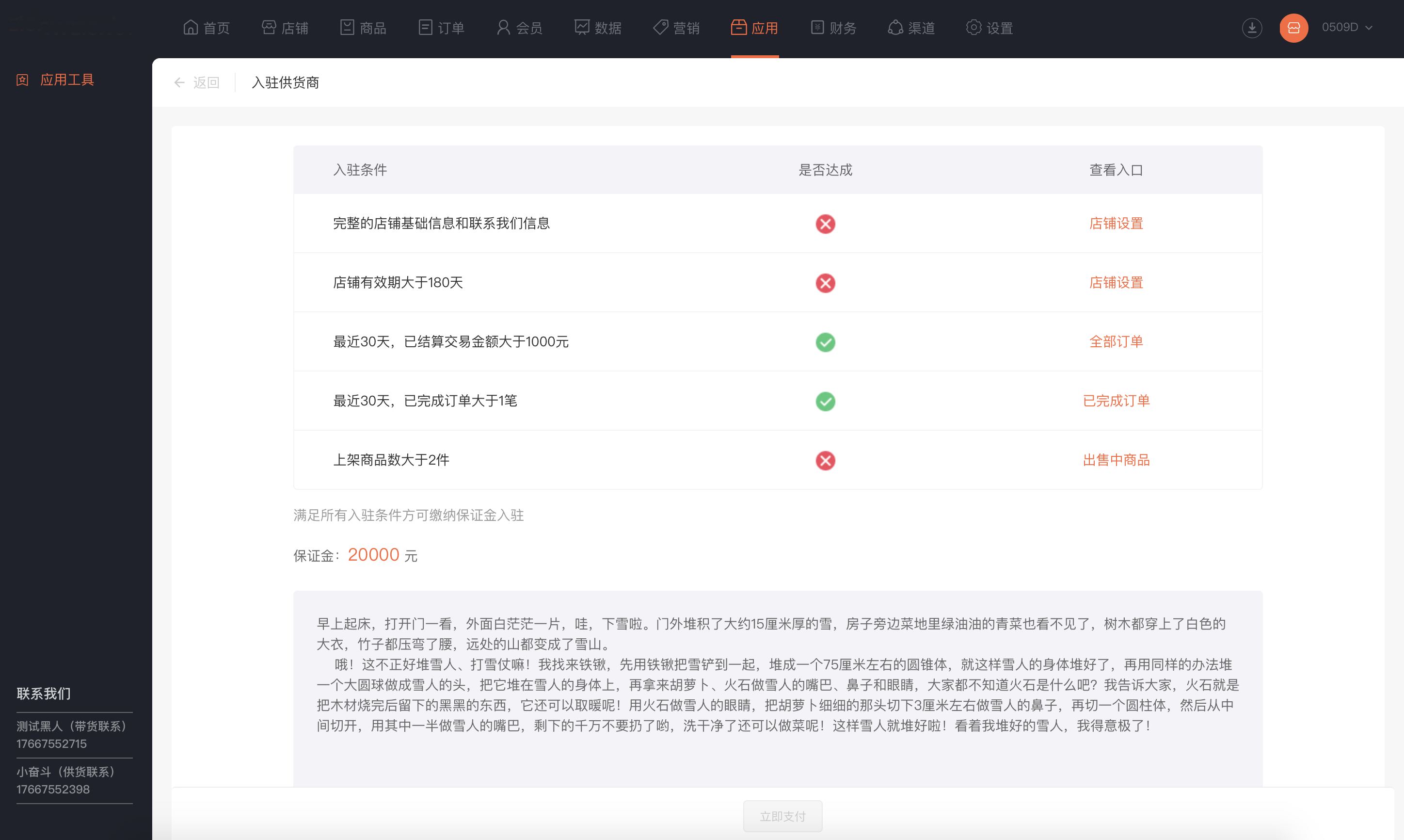 商家在业务端点击“供货商”应用时,将显示当前店铺是否满足供货商条件及保证金内容