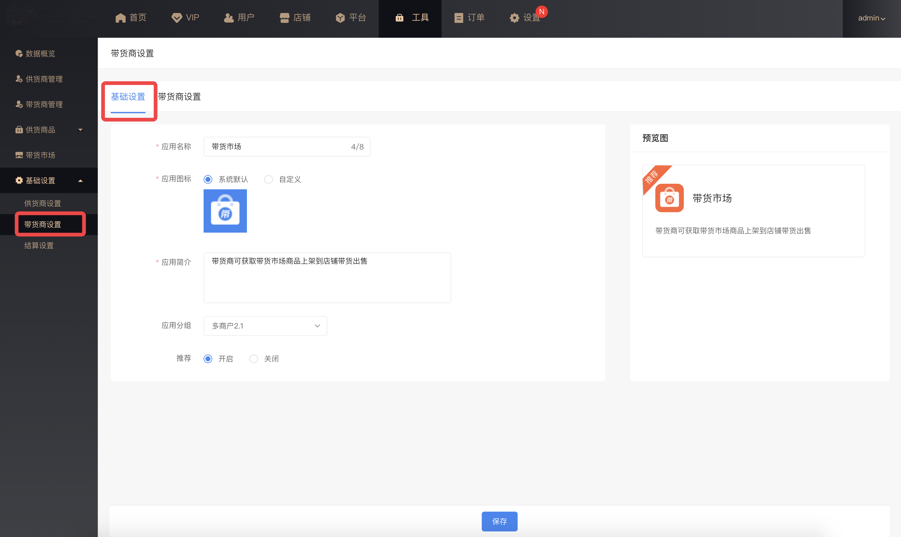 基础设置:平台可设置“带货市场”应用名称和应用简介及应用分组