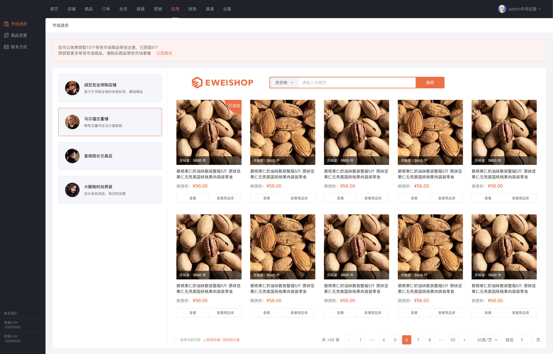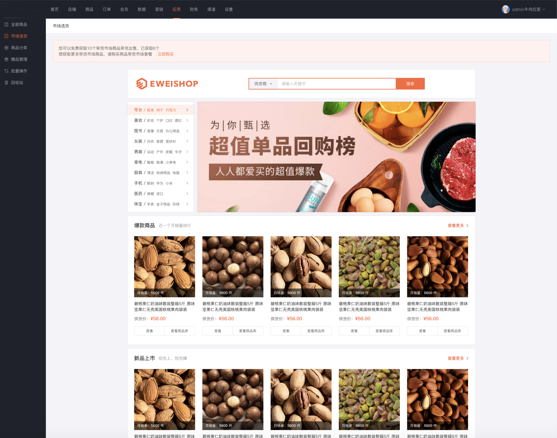 开启带货商后,商城可以从带货市场获取供货商品,上架到店铺出售