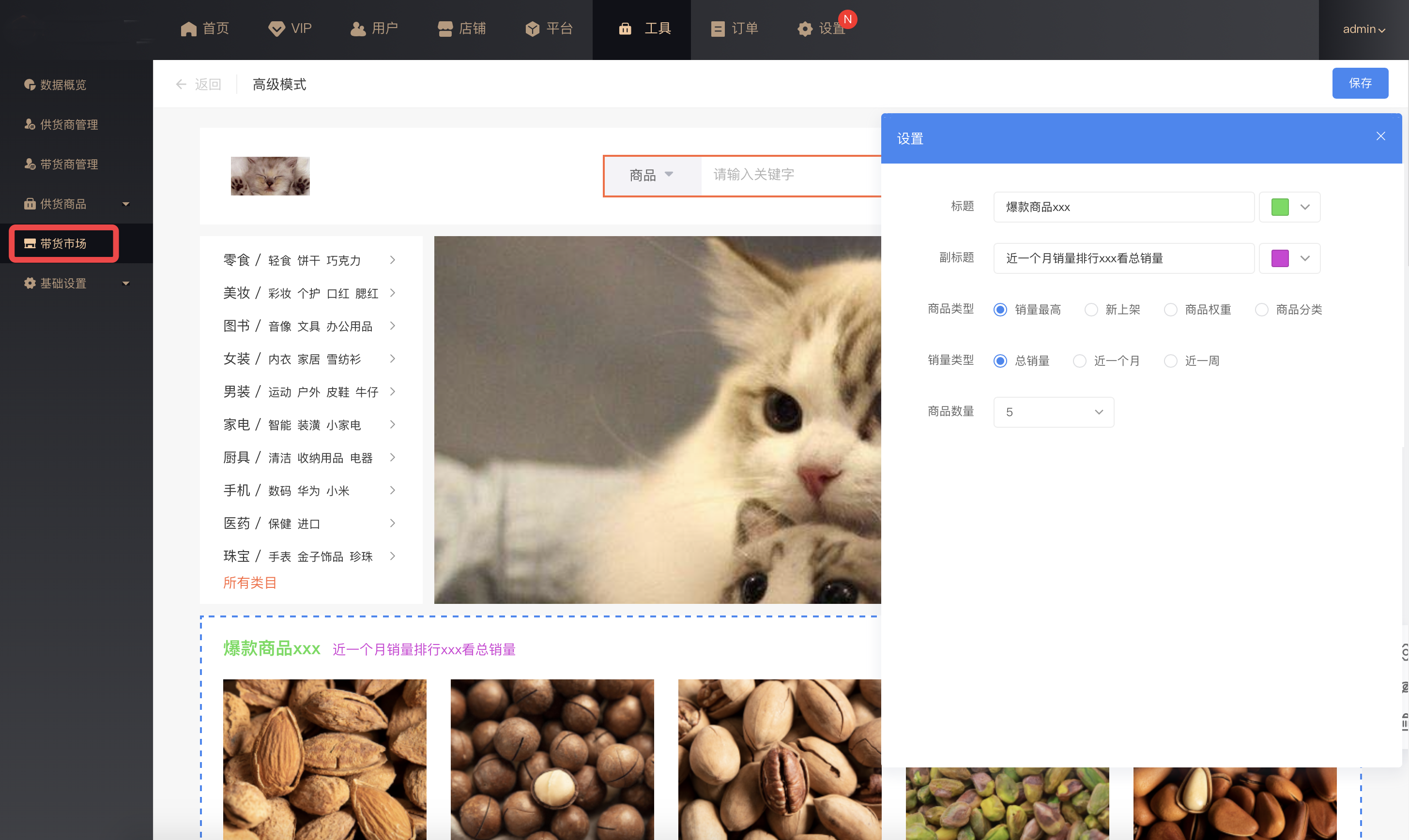 高级模式:展示商品分类、轮播图等,可根据需求装修带货市场