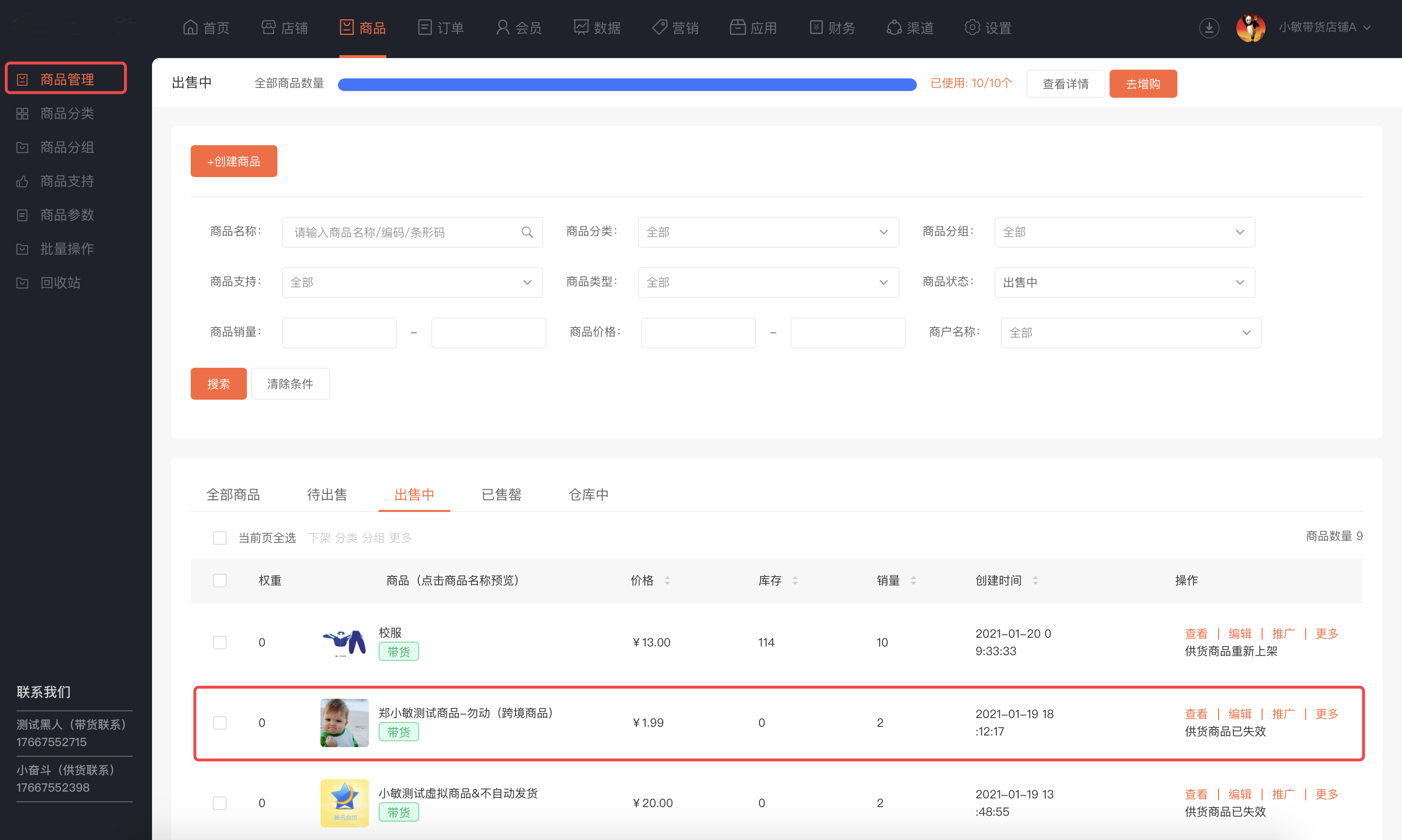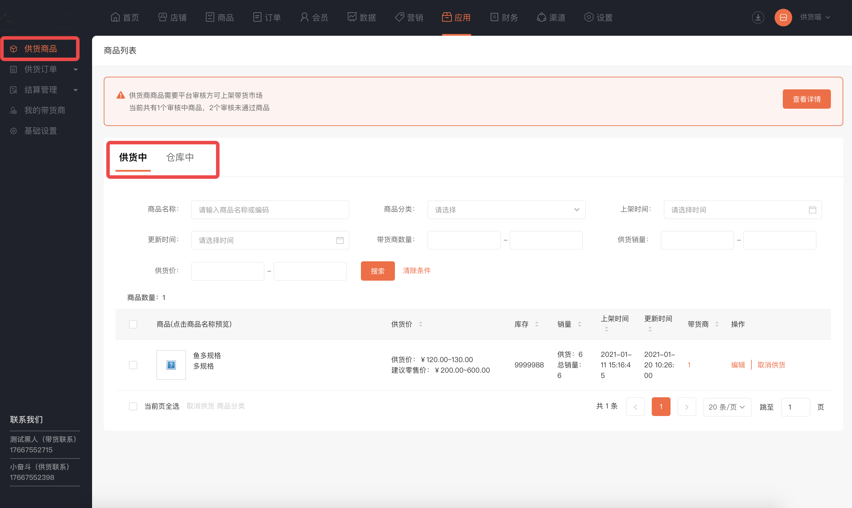 商品管理列报表中显示带货商品,显示带货标签和供货商信息,显示商品变更提示