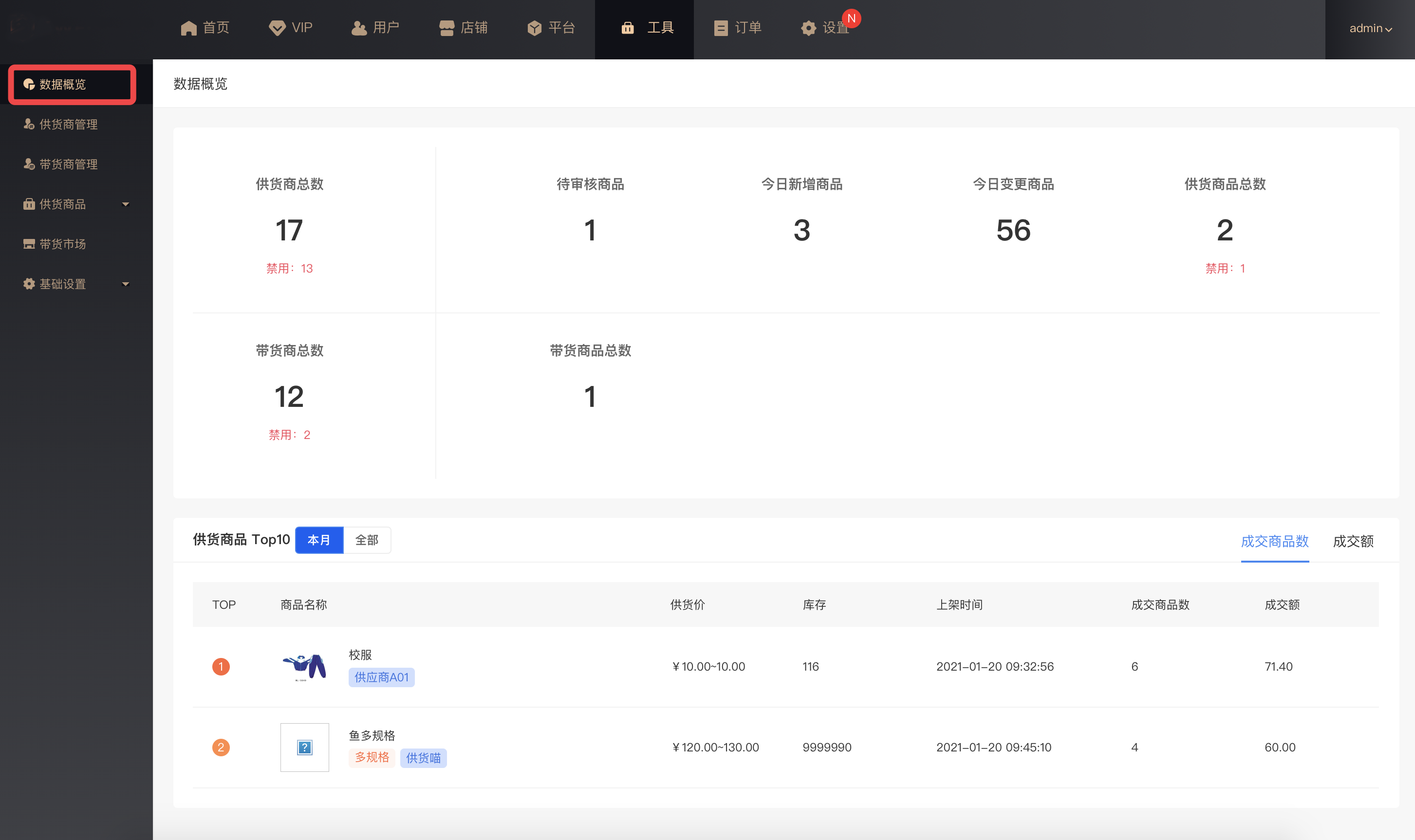 供货商品Top10:成交商品排行和成交额商品排行