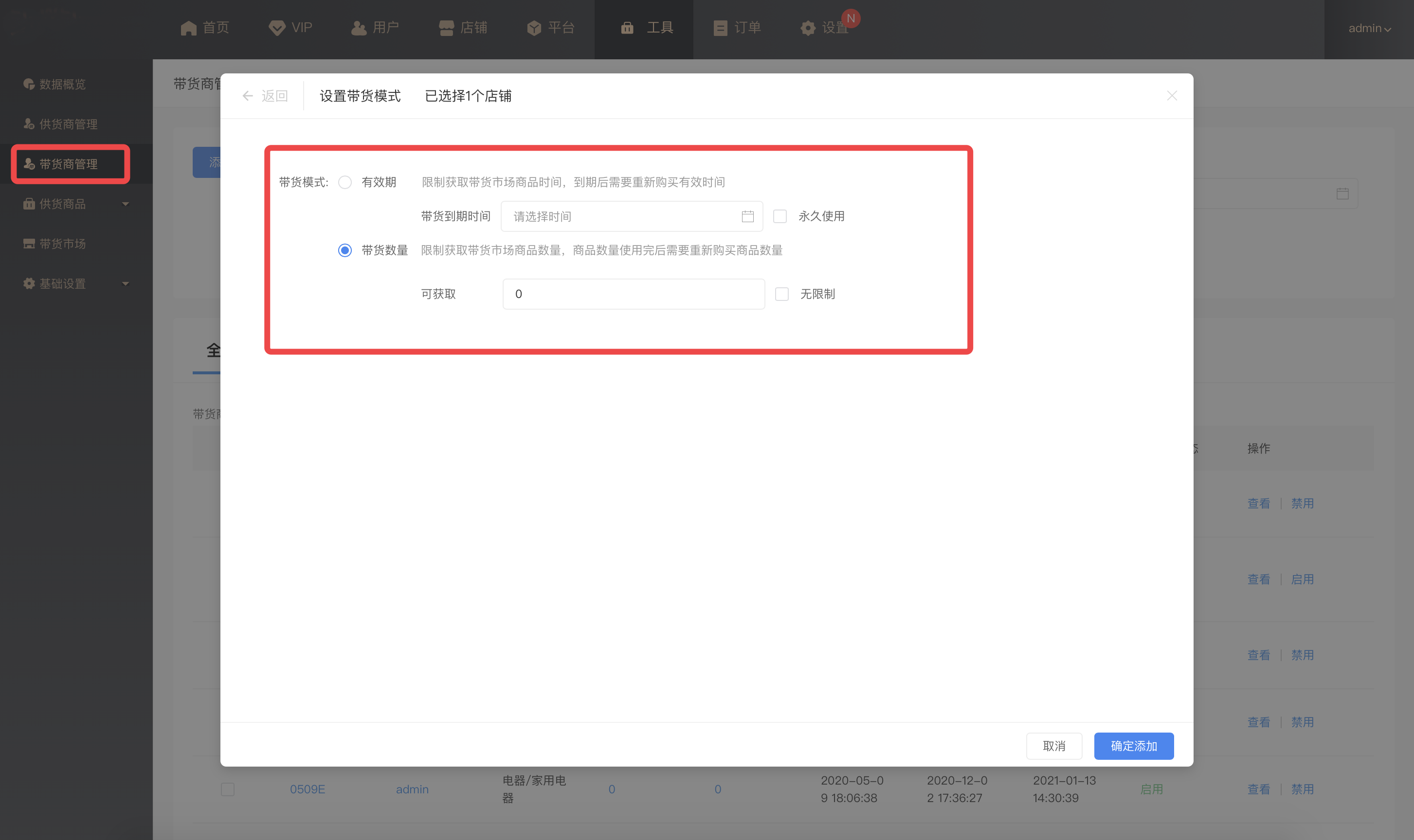 带货模式:可单独设置带货商的带货模式(有效期,带货数量)