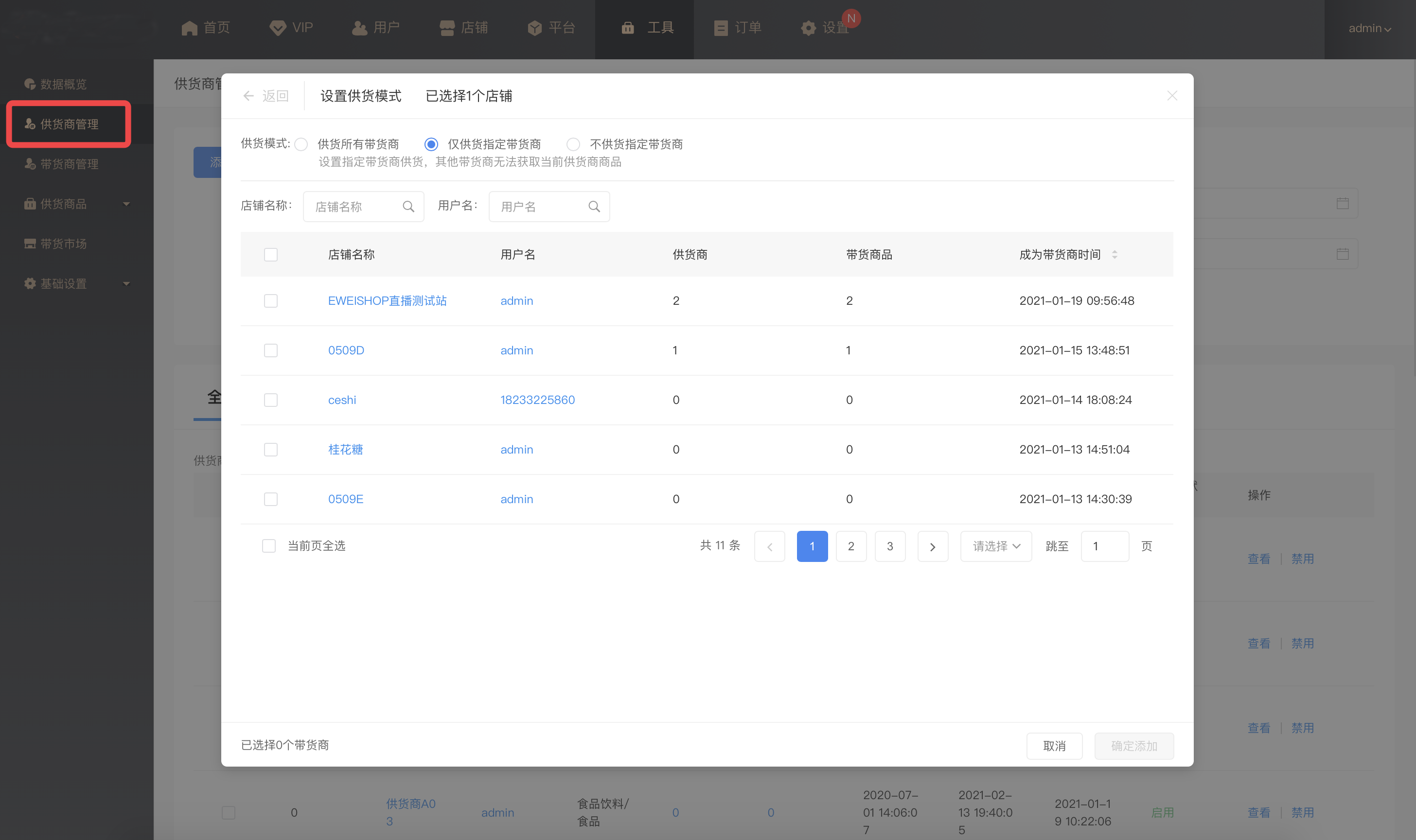 添加带货商:平台可手动添加店铺成为带货商,并且设置该带货商的带货模式