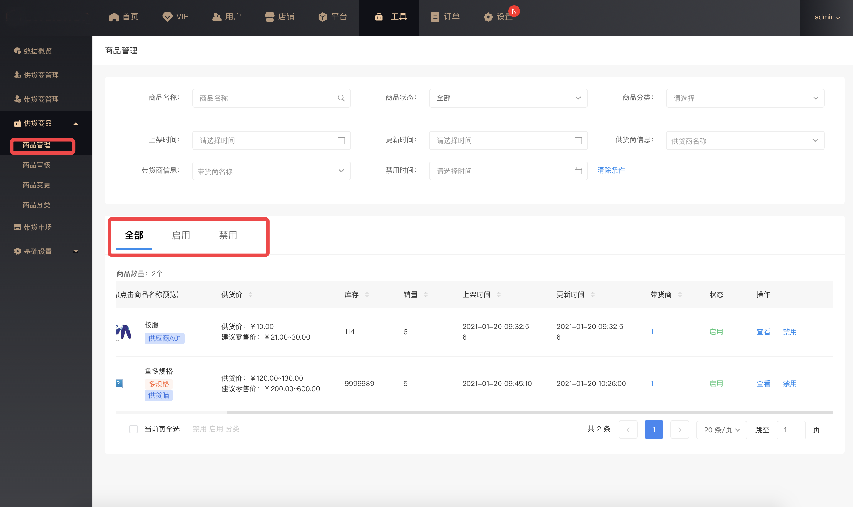 管理供货商品:启用(该商品正常在带货市场中显示)