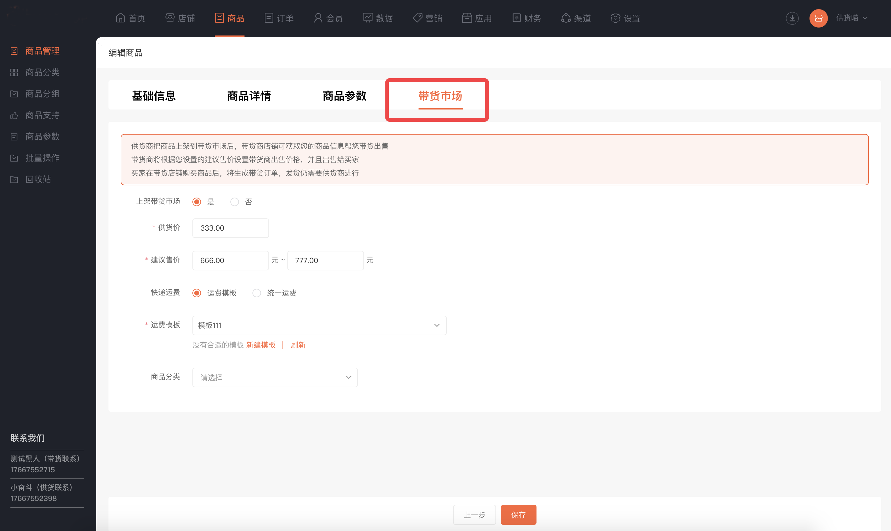 开启供货商后,商城可以把供货商品上架到带货市场,供带货商获取并推广出售