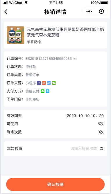 按商品核销次数核销:会员购买商品后,可根据商品可核销次数分多次进行核销。