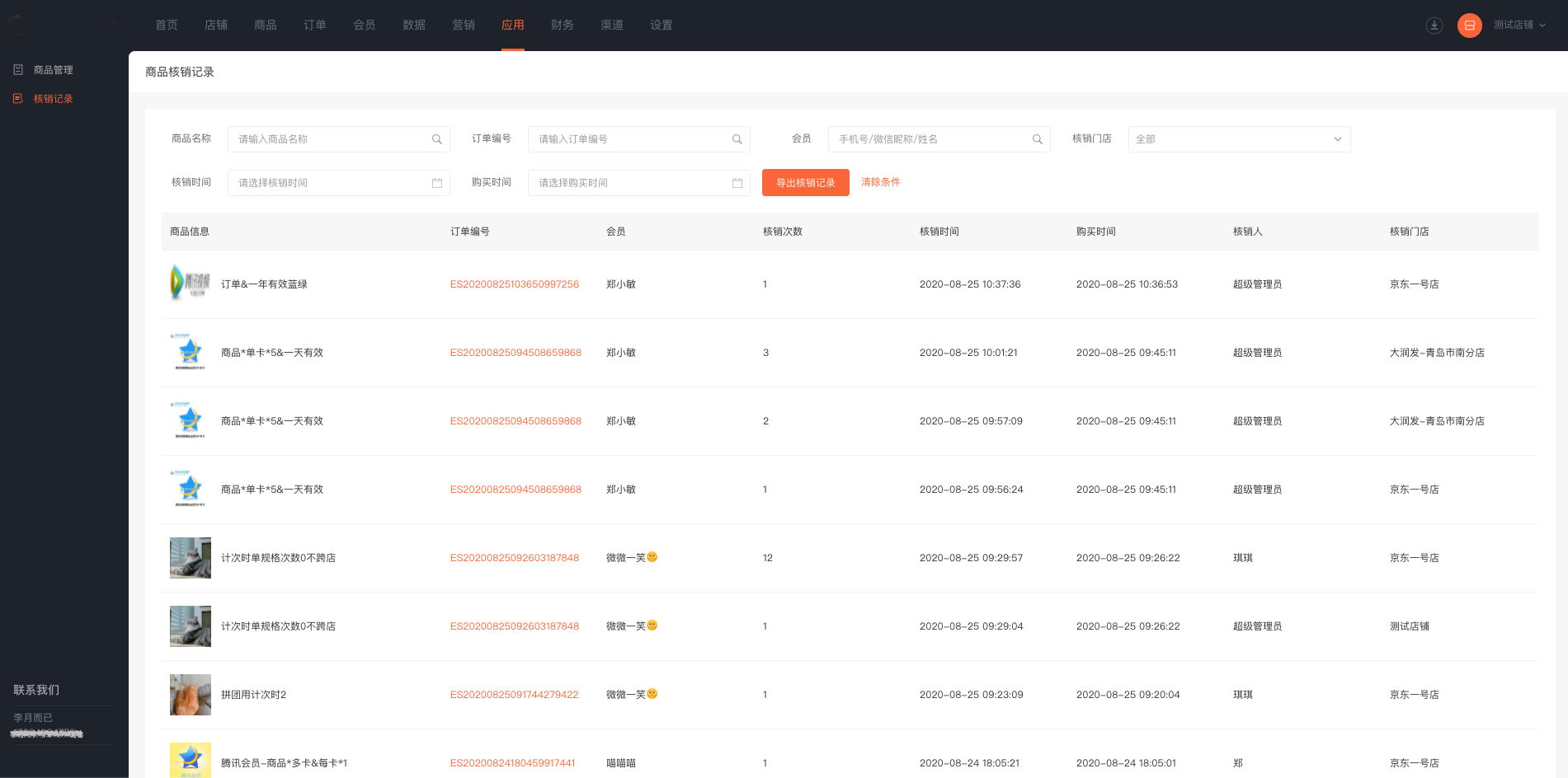 核销记录支持按照商品、会员、核销门店、核销时间等进行筛选,并支持导出