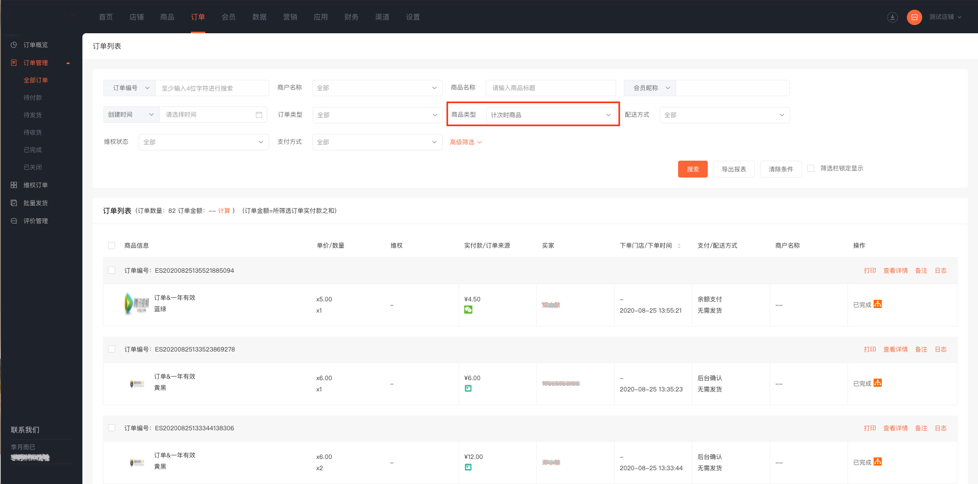 (1)可根据商品类型,筛选计次时商品订单。