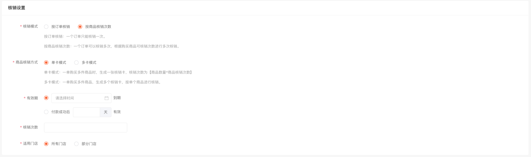核销次数:会员购买商品后, 可以分几次进行核销使用,多规格商品按规格进行设置。**当核销次数设置为0时,在有效期内可以无限次核销。**