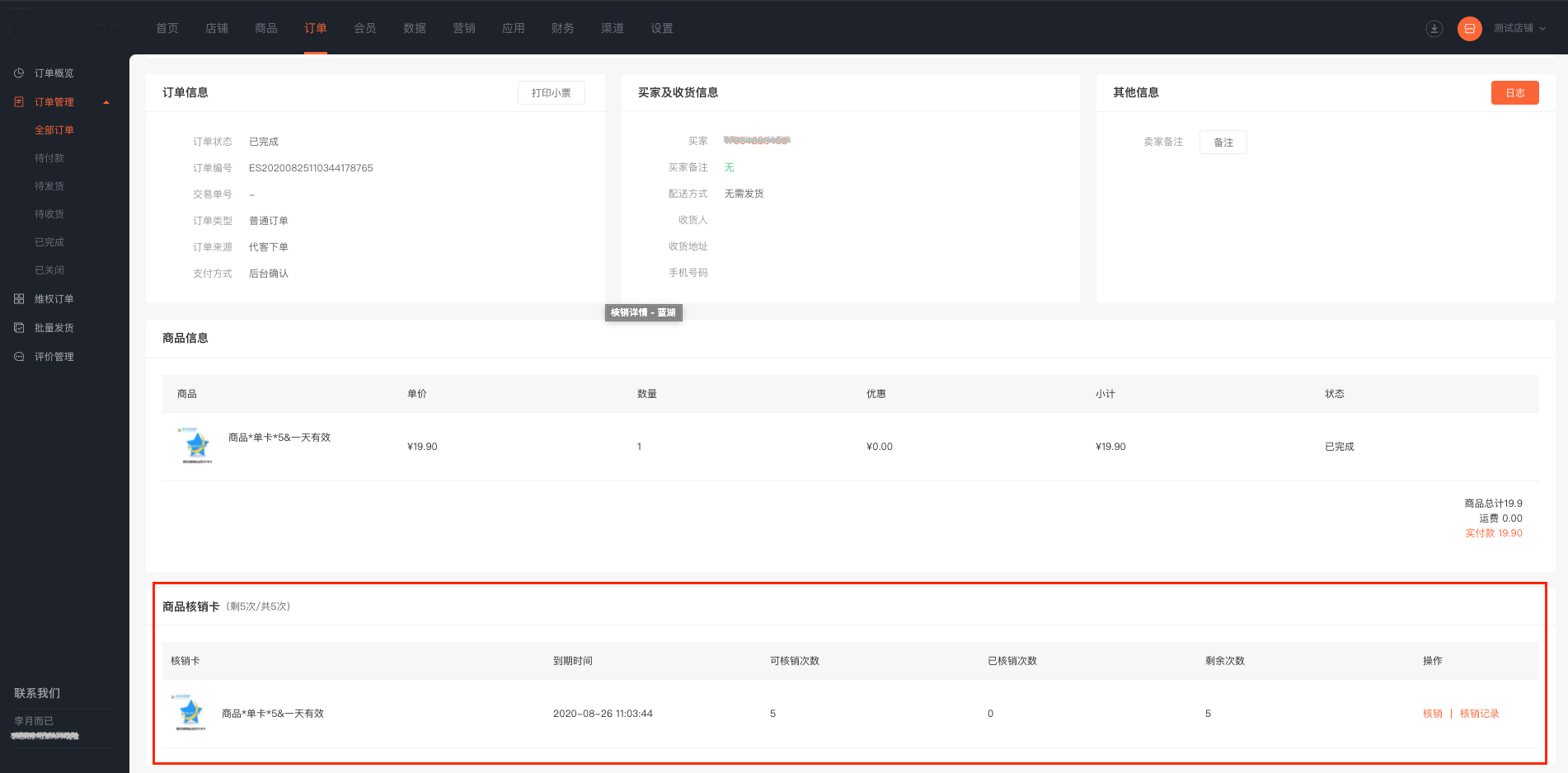 (2)订单详情显示该订单包含的商品核销卡,可以进行核销操作,并可查看核销记录。