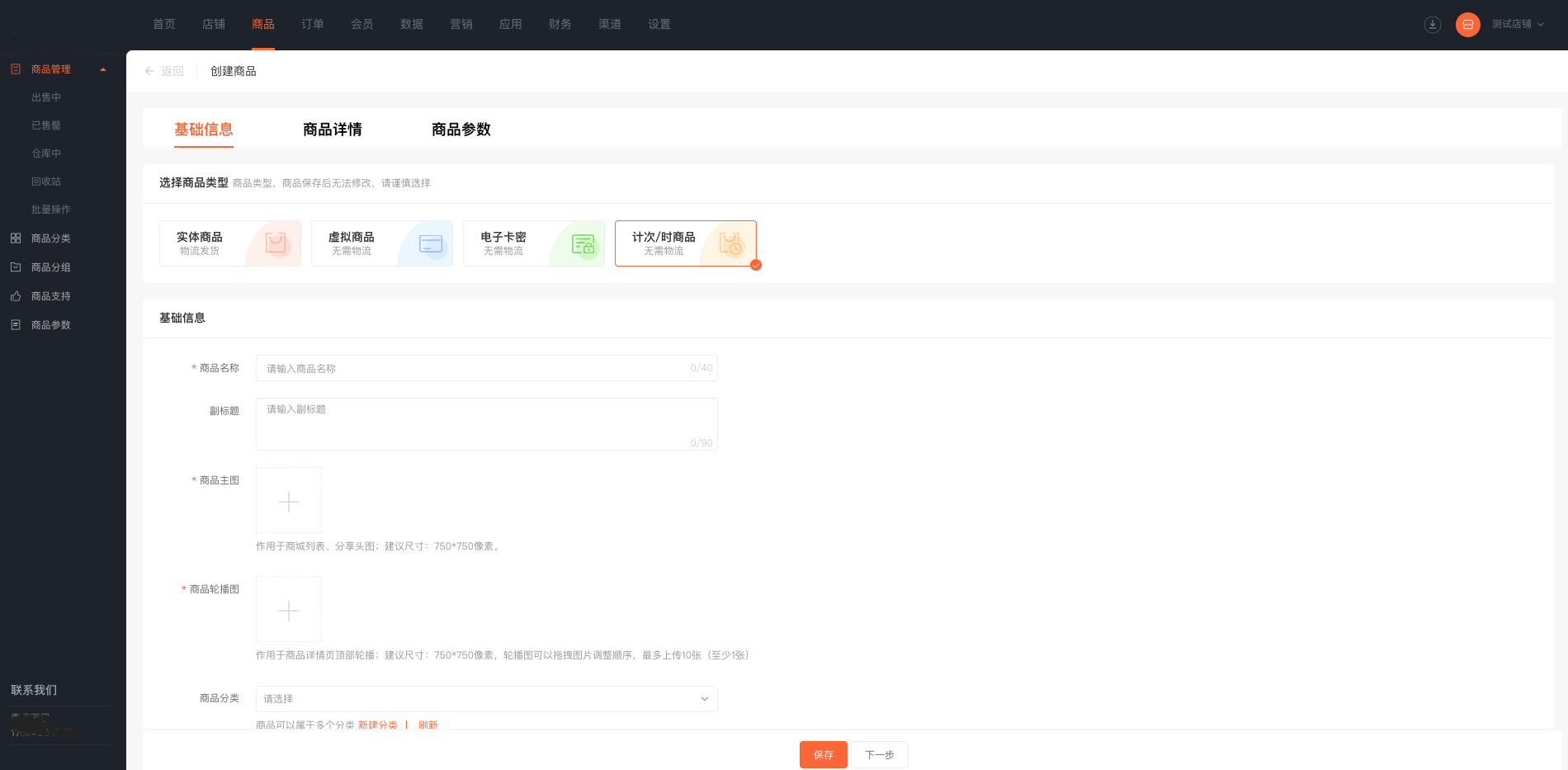 (1) 商品类型选择计次/时商品,设置商品名称、图片等基础信息。