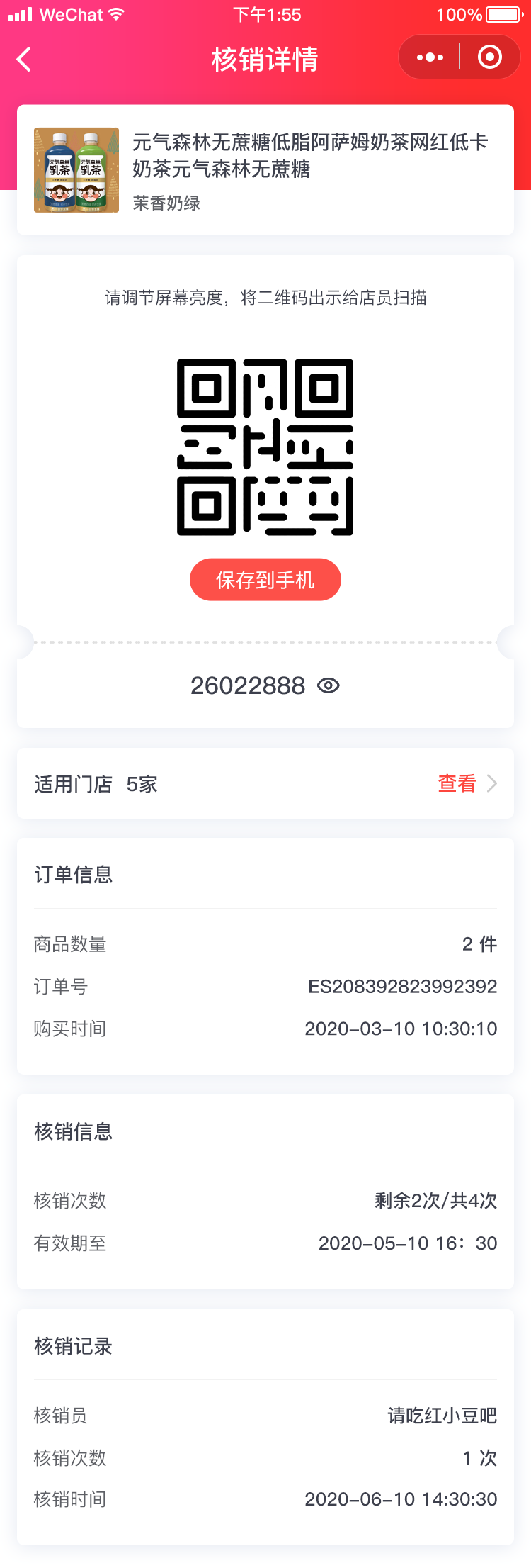 (4)核销记录包含:核销时间、核销次数、核销人和核销门店。