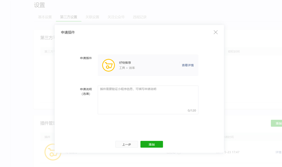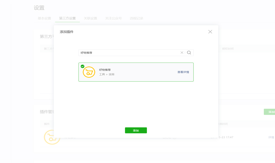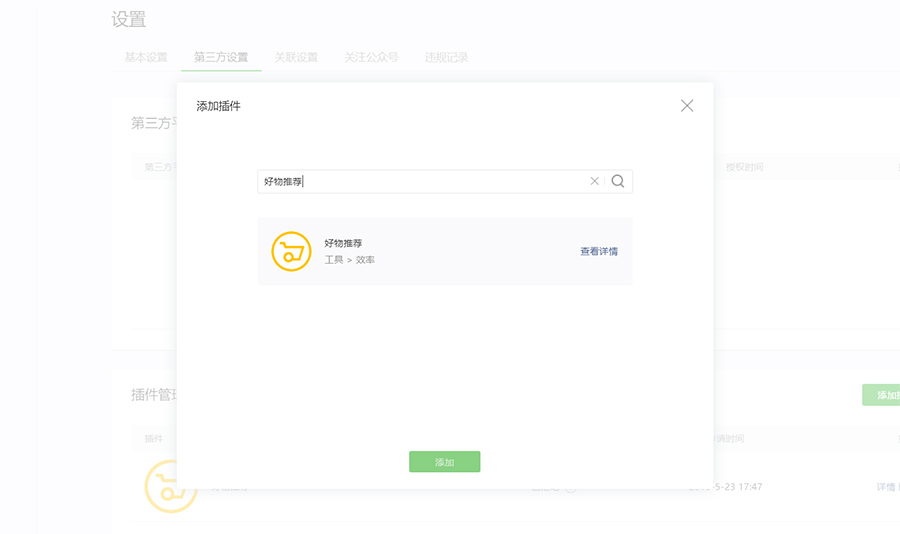 3、点击“添加插件”,搜索“好物推荐”并添加,提交审核通过后用户需在EWEISHAOP设置才可用。