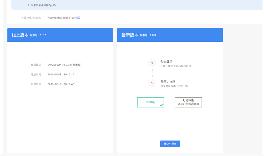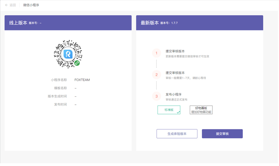 2)上传时可选择版本,分别为“标准版”和“好物圈版”,管理端如仅发布其中一版,业务端也将仅显示发布的这个版本;管理端选择两版同时上传并发布,业务端会展示2个可选版本,但仅可选择其中一个版本进行发布。例:1.7版本同时发布“标准版”和“好物圈版”2个版本,业务端会显示2个版本,可从中选择1个进行发布;1.8版本只发布“标准版”和“好物圈版”中的一个版本,那么业务端只会显示1个版本并只能选择此版本进行发布。