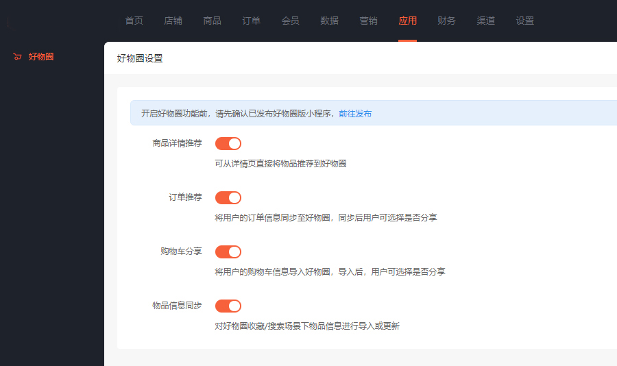 4)业务端设置:“好物圈”以插件形式展现,点击插件显示如图所示信息,您可根据自身需求设置需要开启的功能页。