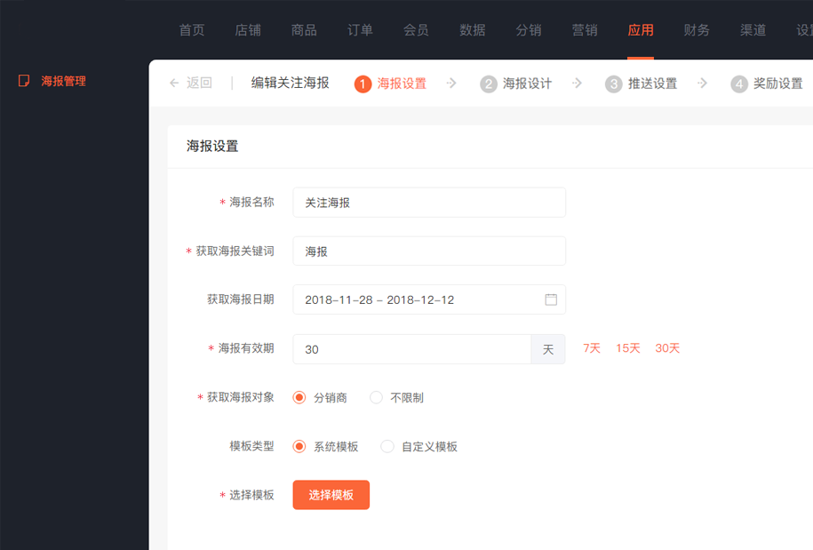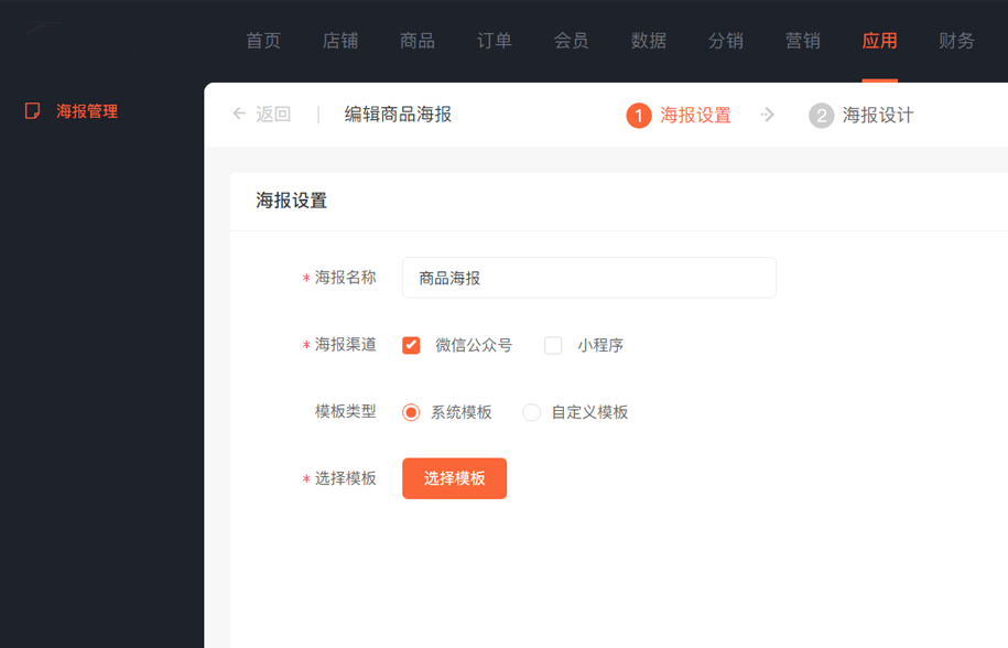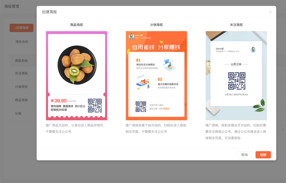 业务端管理员点击应用—创建海报,选择海报的类型:商品海报、分销海报和关注海报