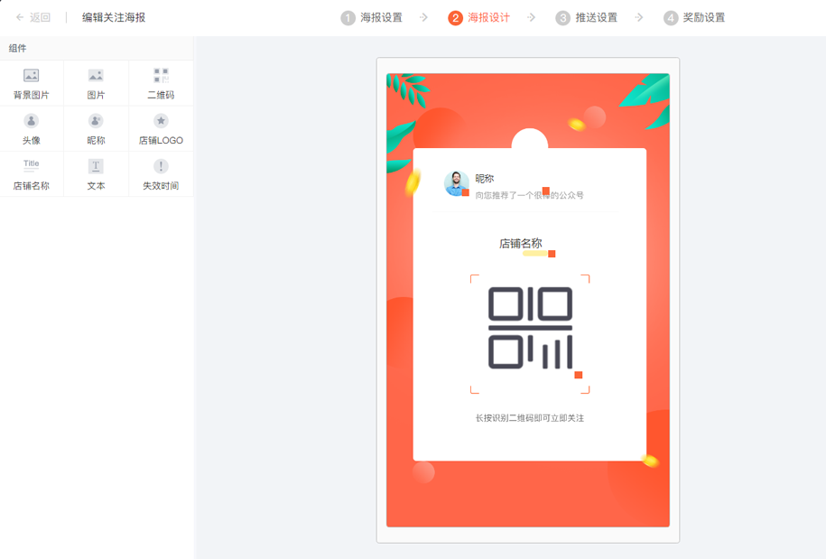 设计海报,管理员可以根据业务端后台提供的组件对商品海报进行设计,海报的二维码可在右侧切换颜色。
