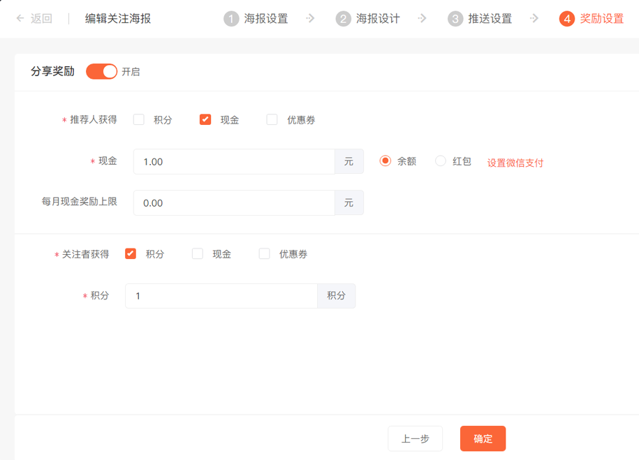 奖励设置,管理员根据实际需求选择是否开启分享奖励,如果选择开启,则需要设置推荐人奖励和关注者奖励,奖励类型分为积分、现金和优惠券3种。温馨提示:选择红包,需要设置微信支付