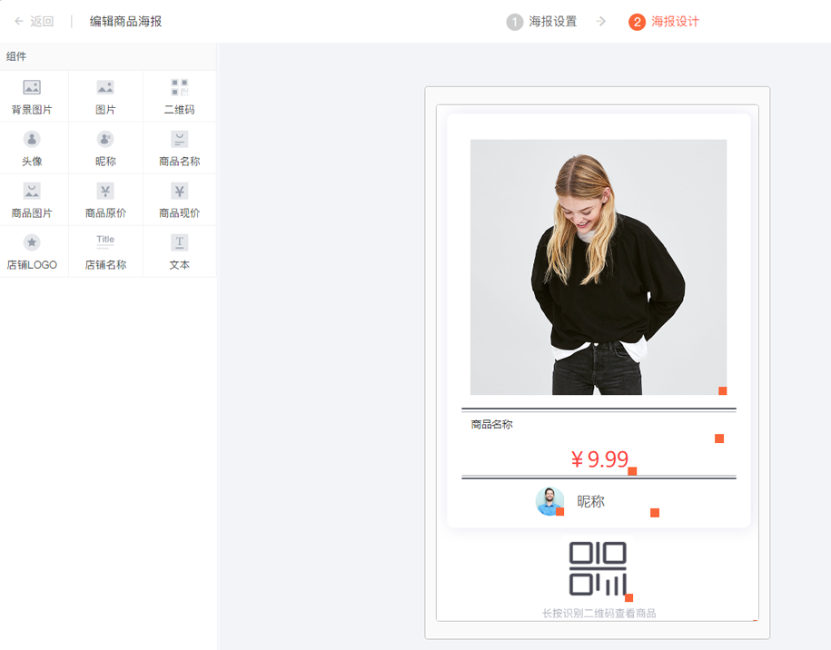 设计海报,管理员可以根据业务端后台提供的组件对商品海报进行设计