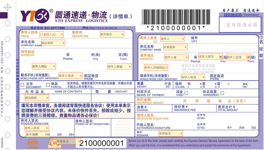 比如:这个快递模板选择的快递公司是圆通快递,那么在底图上就上传圆通快递,在根据底图去选择需要打印的内容框,参见下图: